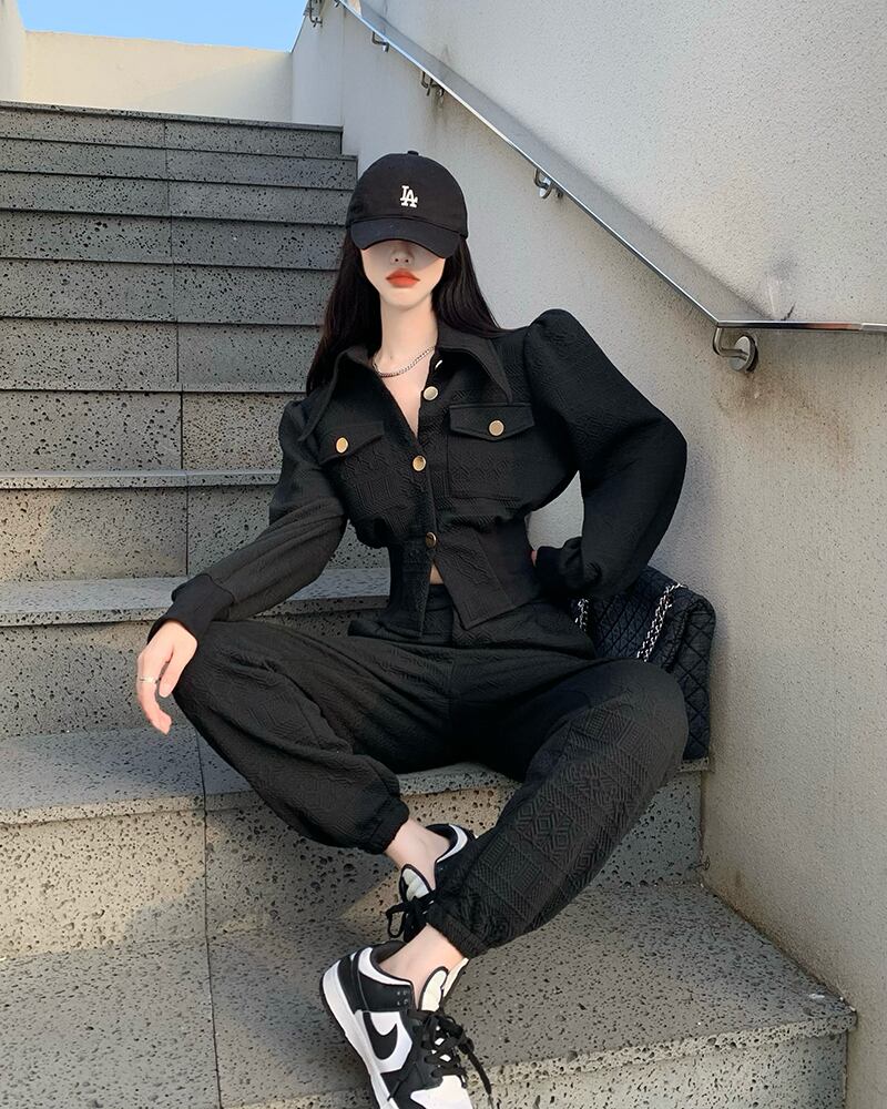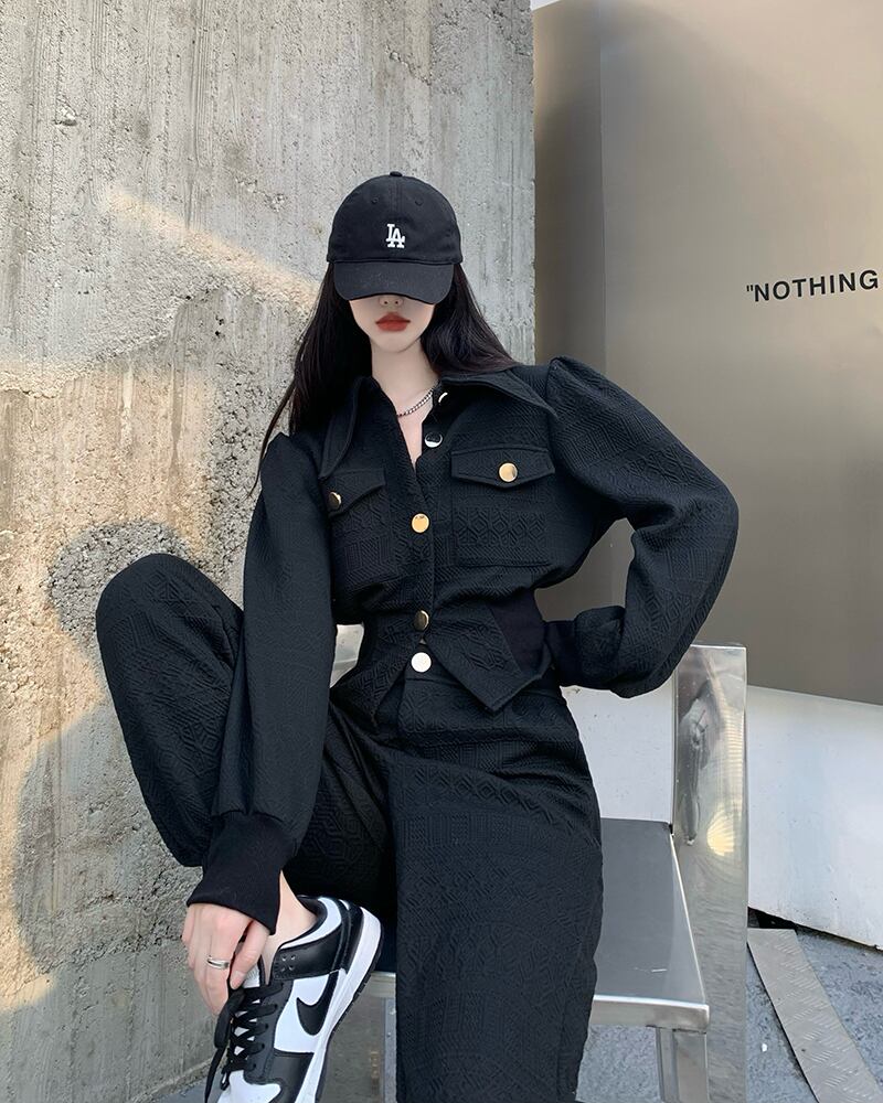 ホットガールスーツ秋ゴールドボタンターンダウン襟スリムフィットトップウエストワイドレッグパンツ 2 点セット オータム 秋物 ワイドパンツ