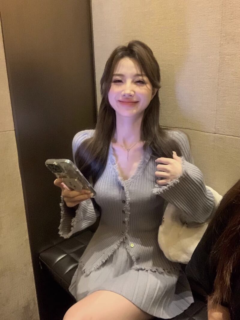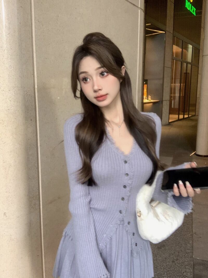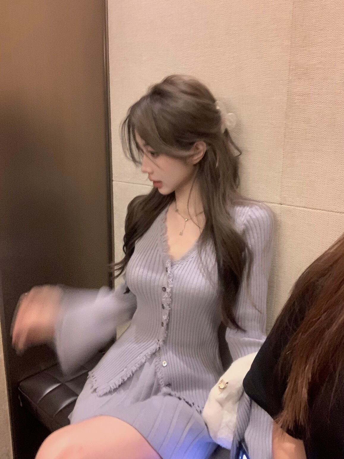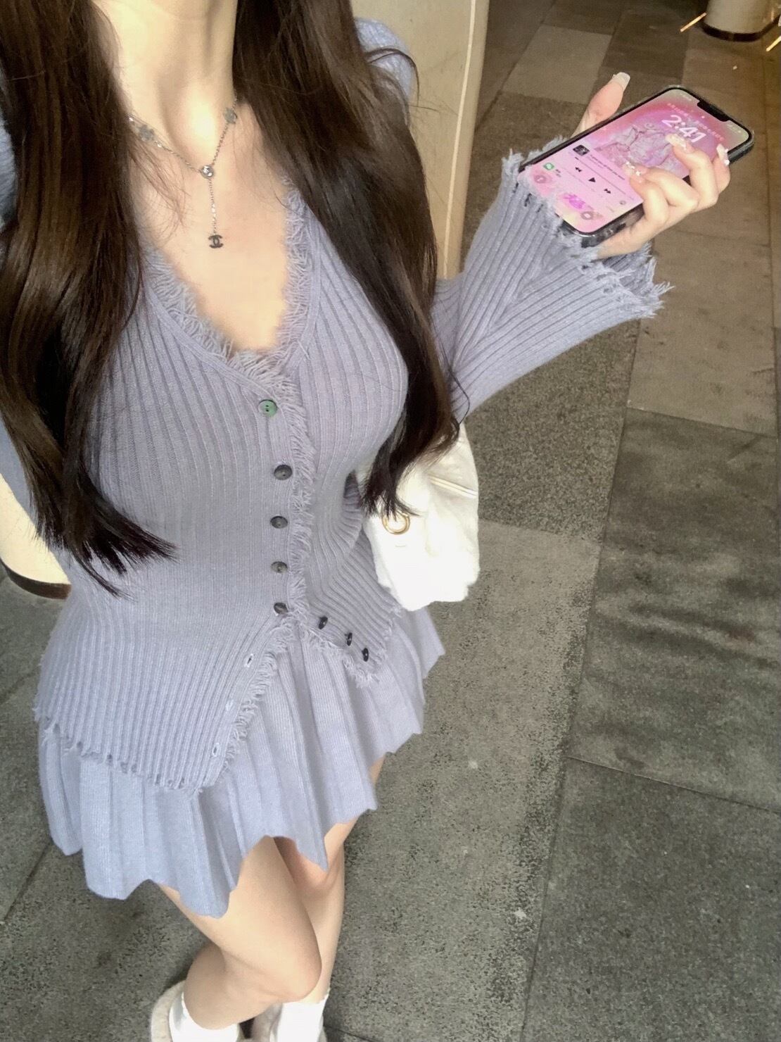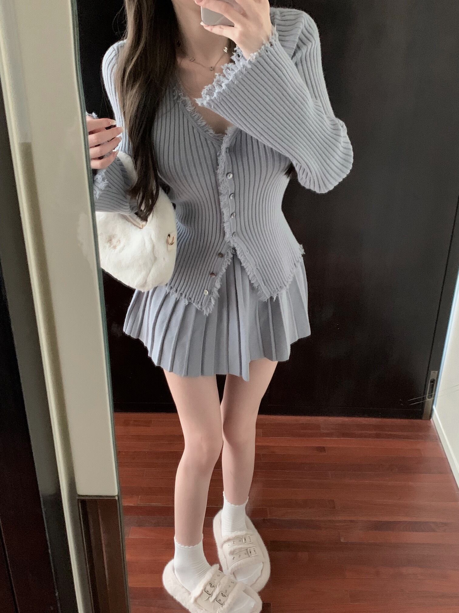 甘いホットガールスーツ秋純粋セクシー V ネックテルピットニットカーディガン A ラインプリーツスカート 2 点セット服 大人ガーリー スウィート キュート カジュアル オータム 秋物 Vネック Aライン ピュア