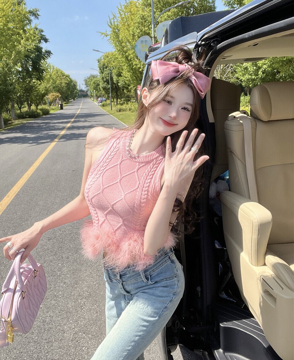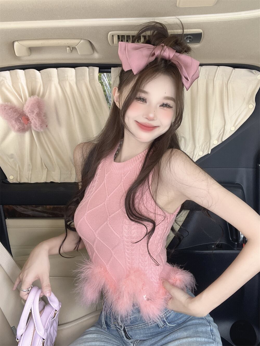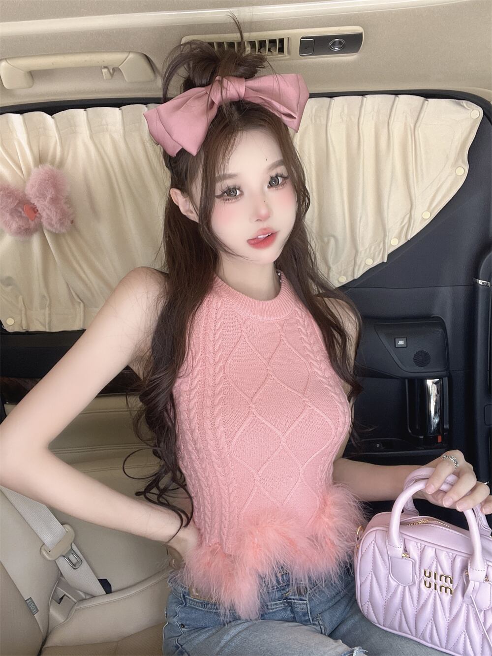 純粋セクシーホットガール O ネックノースリーブファーパッチワークタンクトップ秋スリムフィットニットショートトップ服 オータム 秋物 Oネック