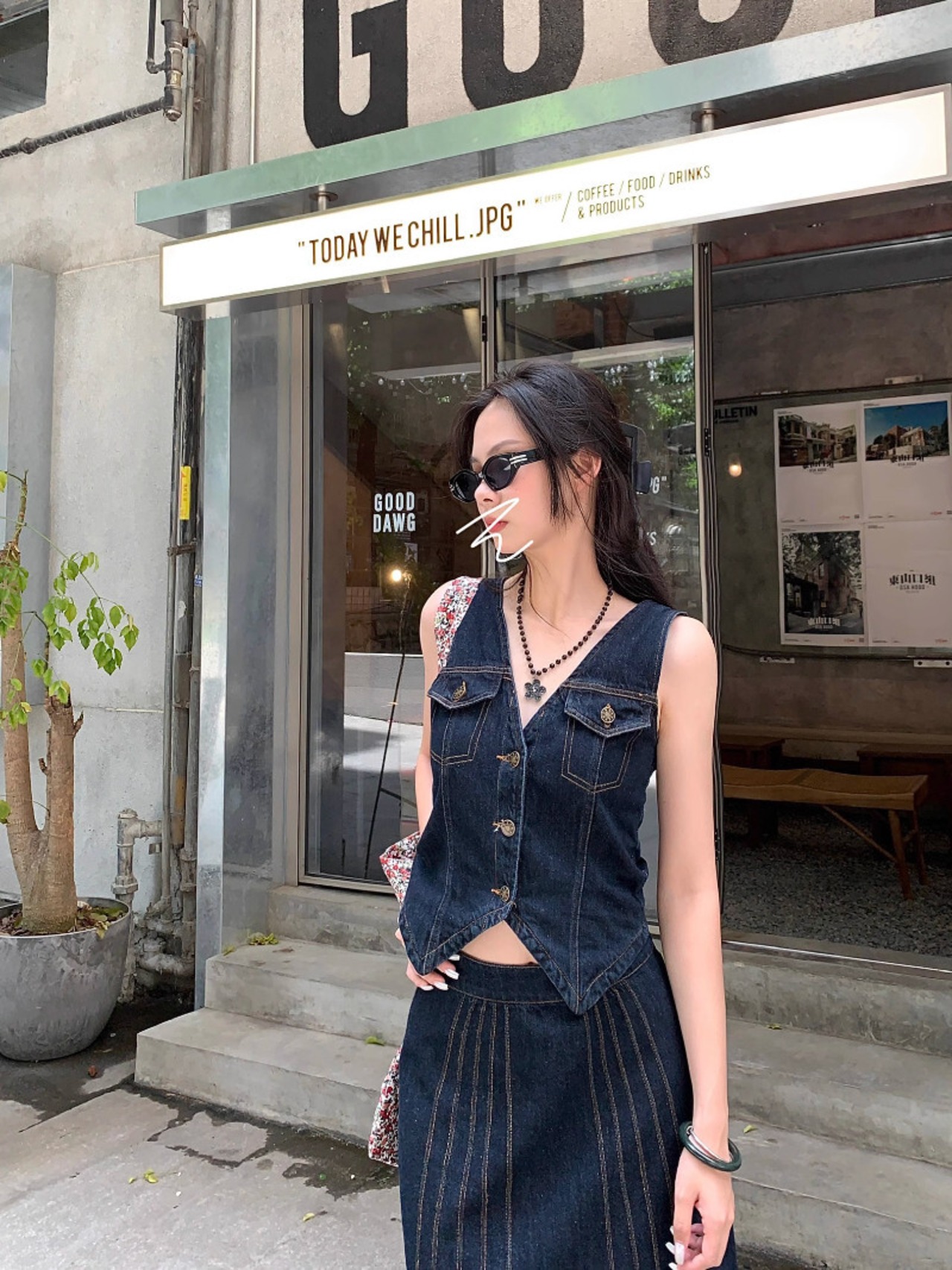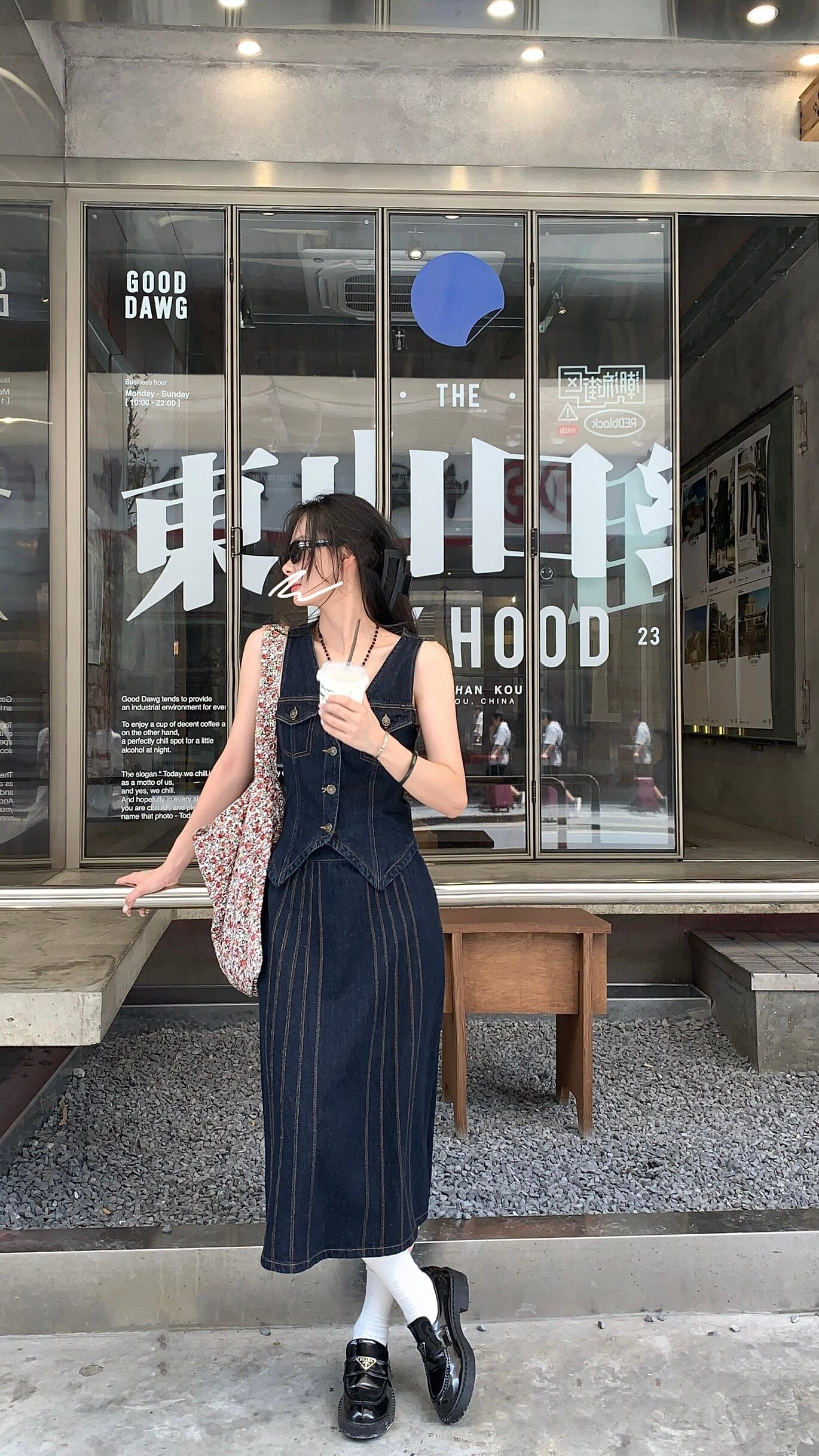 アメリカンデニムスーツ レディース 夏 ノースリーブ Vネック ベスト ウエスト ロングスカート 2点セット 服 サマー 夏物