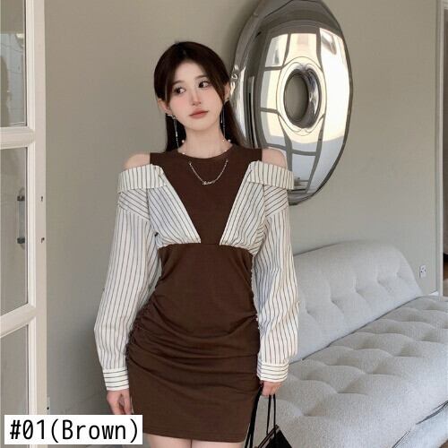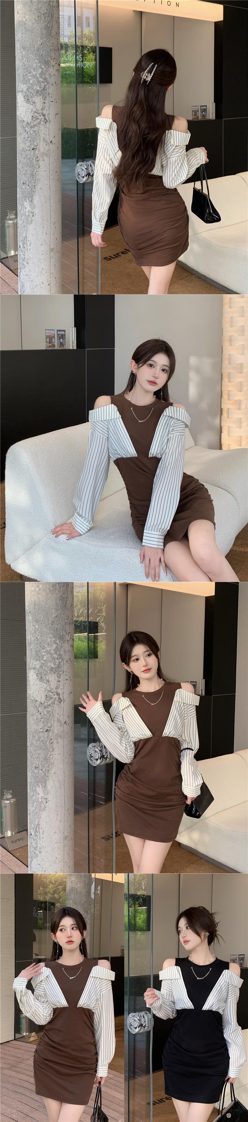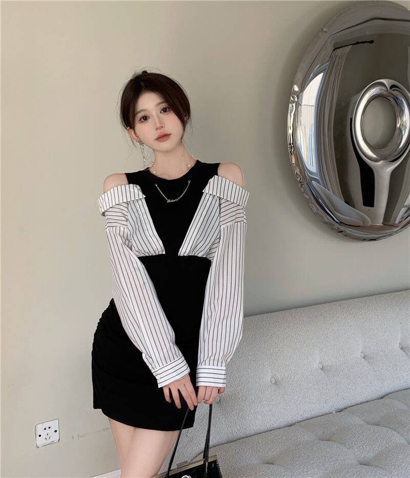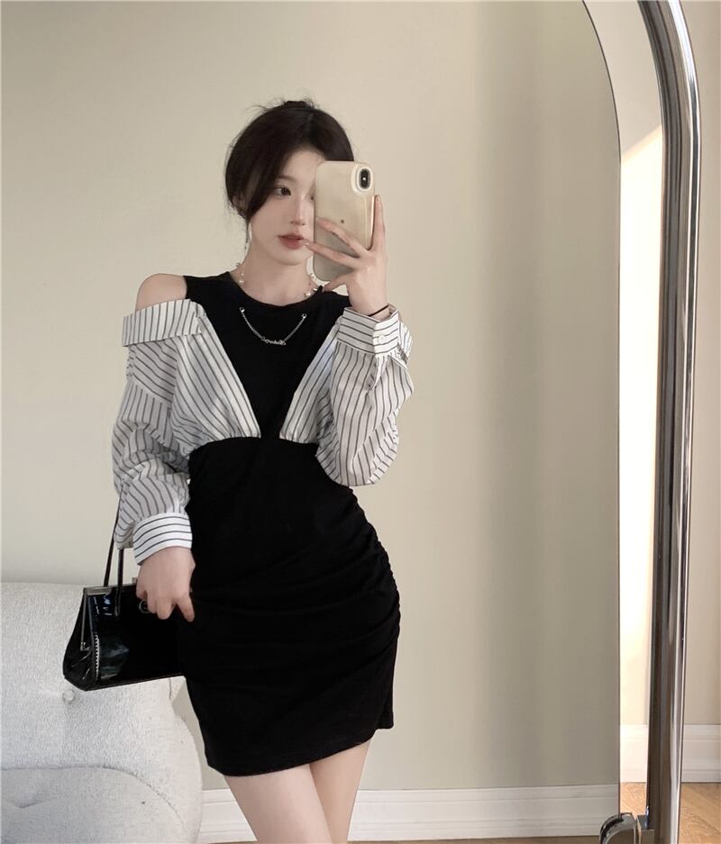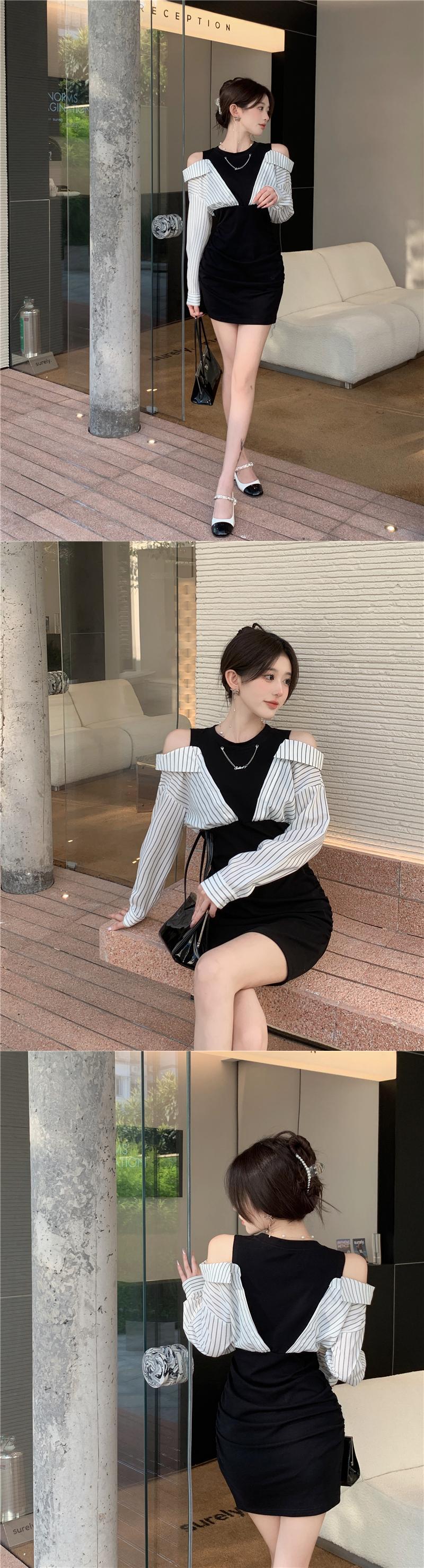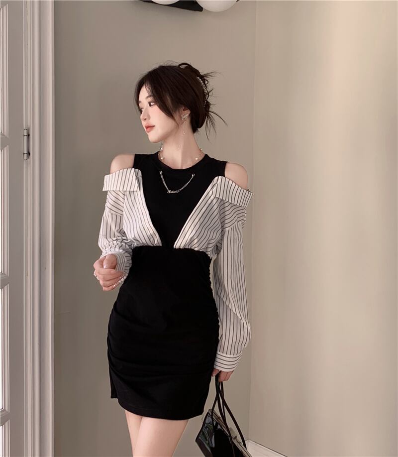 スタイルホットガール秋フェイクツーピースヒップラップドレス秋ストライプオフショルダースリムフィットドレス オータム 秋物