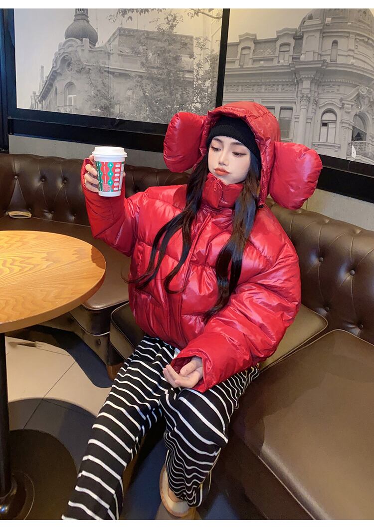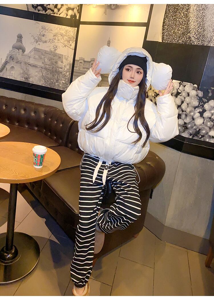甘いホットガール大き耳ショートダウンジャケット冬スタンドカラーフード付き綿パンジャケット服 コットン 大人ガーリー スウィート キュート カジュアル ウィンター 冬物