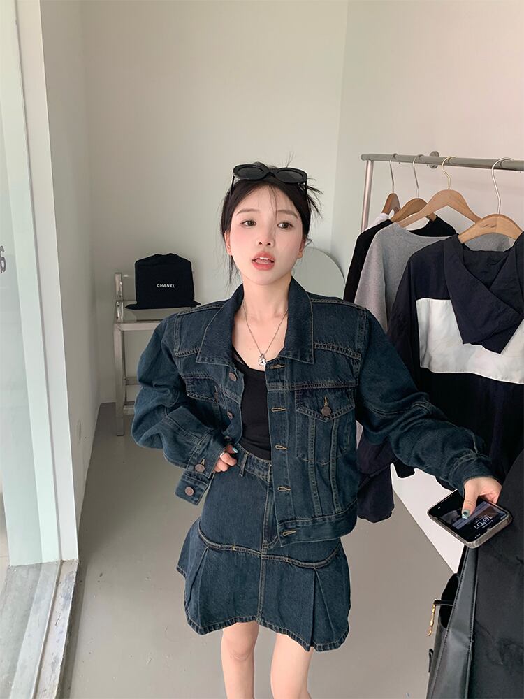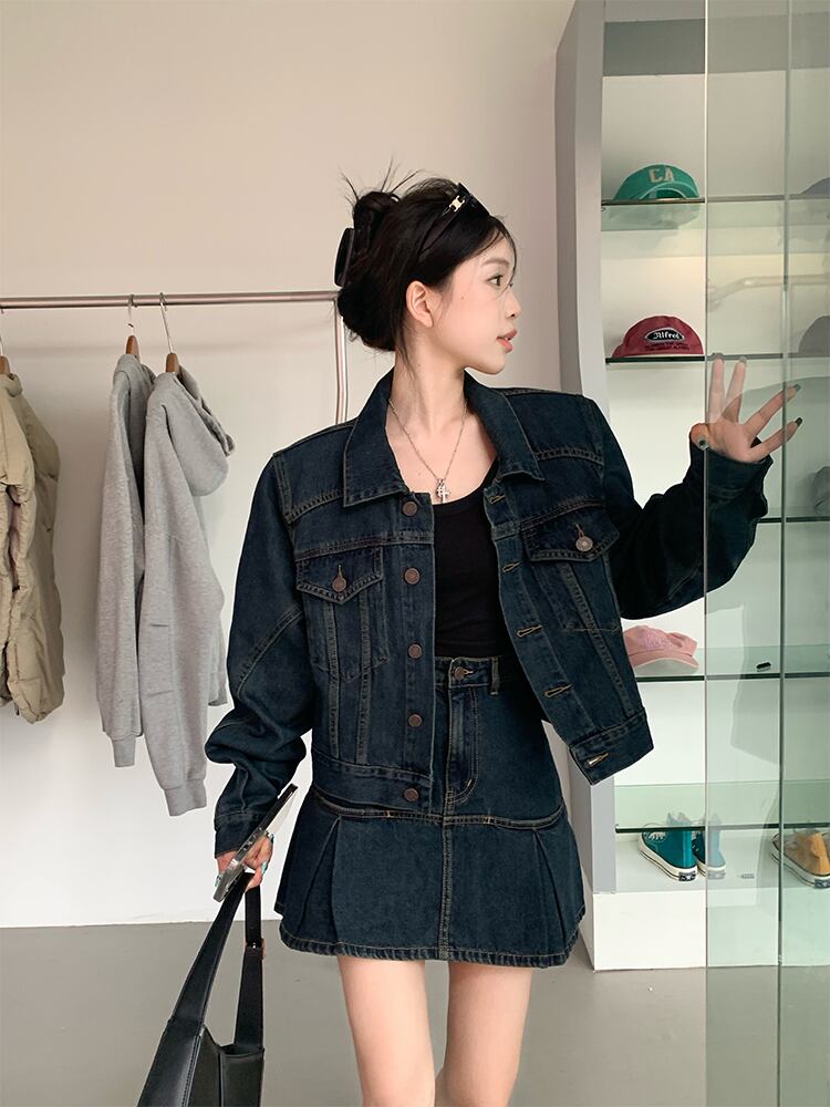 ホットガールズデニムスーツ秋長袖ショートコートウエスト A ラインミニスカート 2 点セット服 ロング オータム 秋物 Aライン