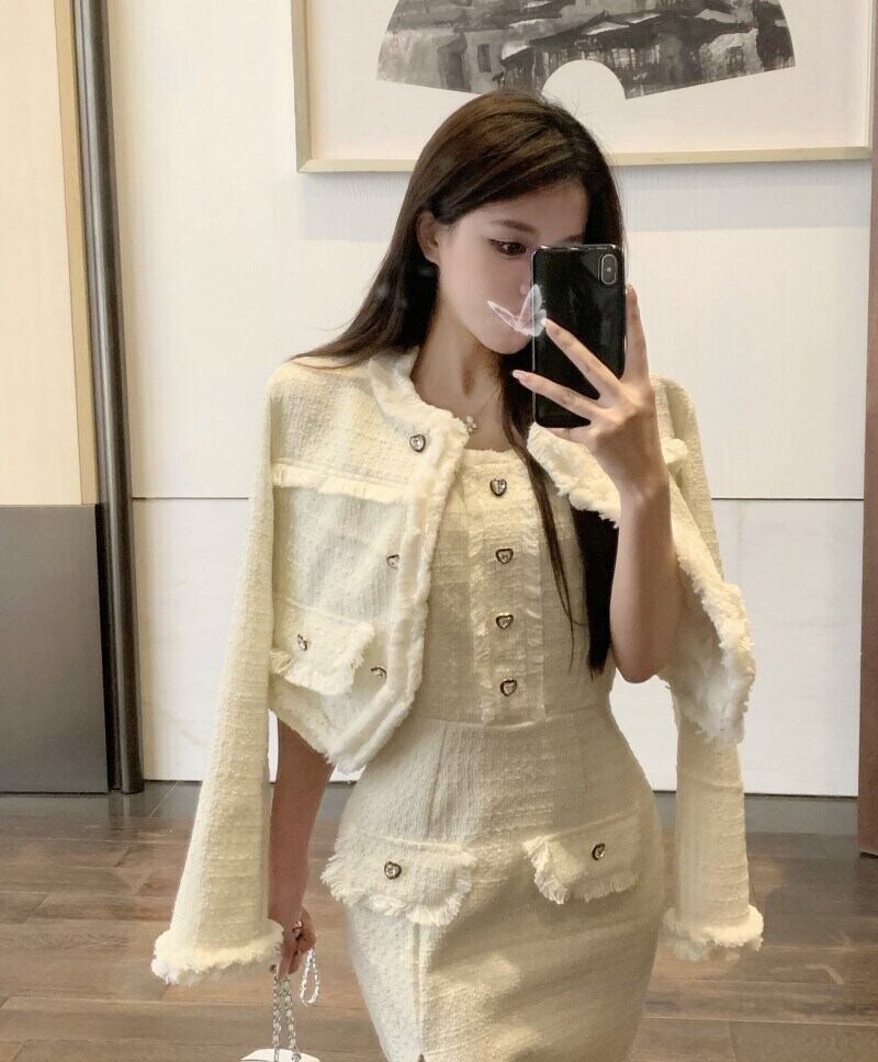 甘いホットガールスーツ秋スリムフィットストラップドレス長袖 O ネックショートコート 2 点セット服 ロング 大人ガーリー スウィート キュート カジュアル オータム 秋物 Oネック