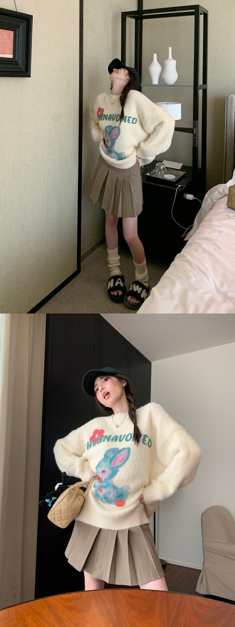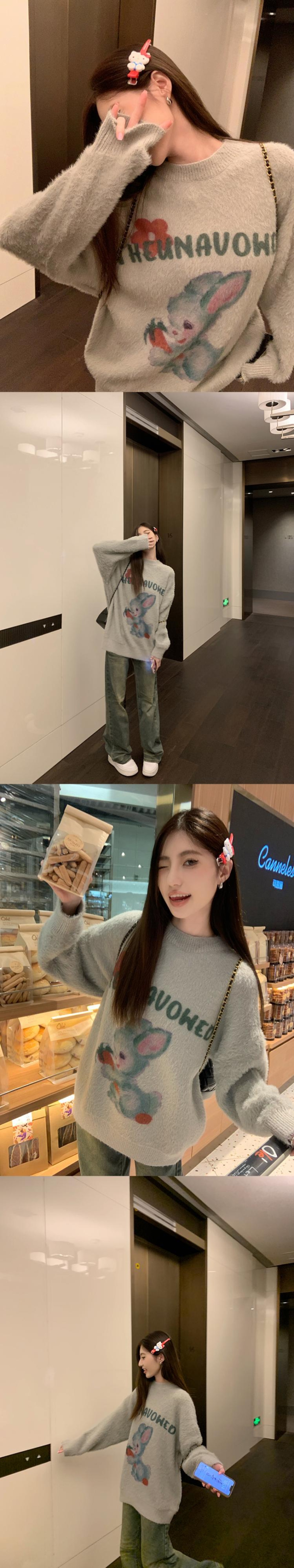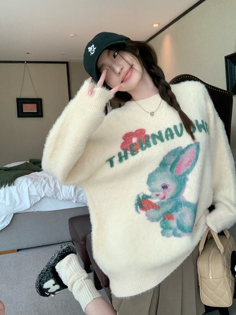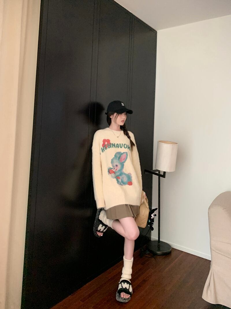 甘い少女漫画ウサギプリントラウンドネックニット秋長袖ルーズプルオーバーセーター服 ロング 大人ガーリー スウィート キュート カジュアル オータム 秋物 Oネック
