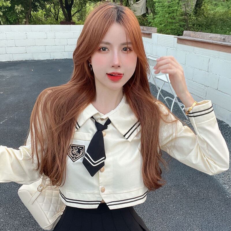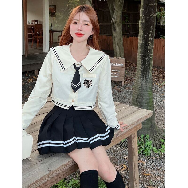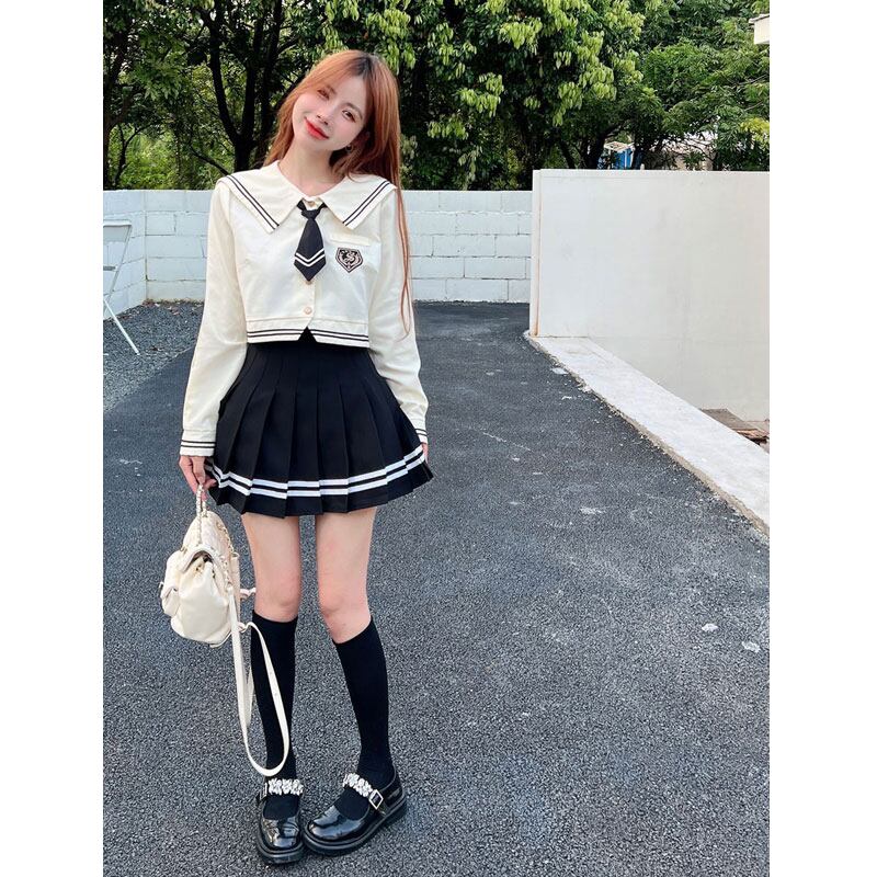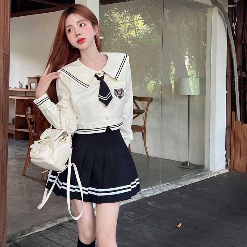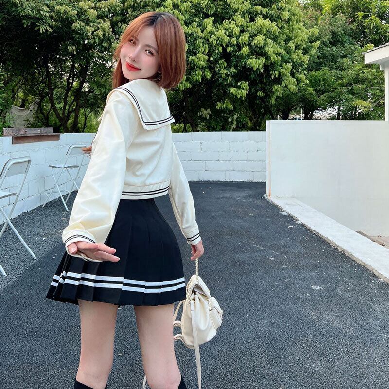 プレッピースタイルスーツ秋セーラー襟ショートシャツウエストプリーツスカート 2 点セット服 オータム 秋物
