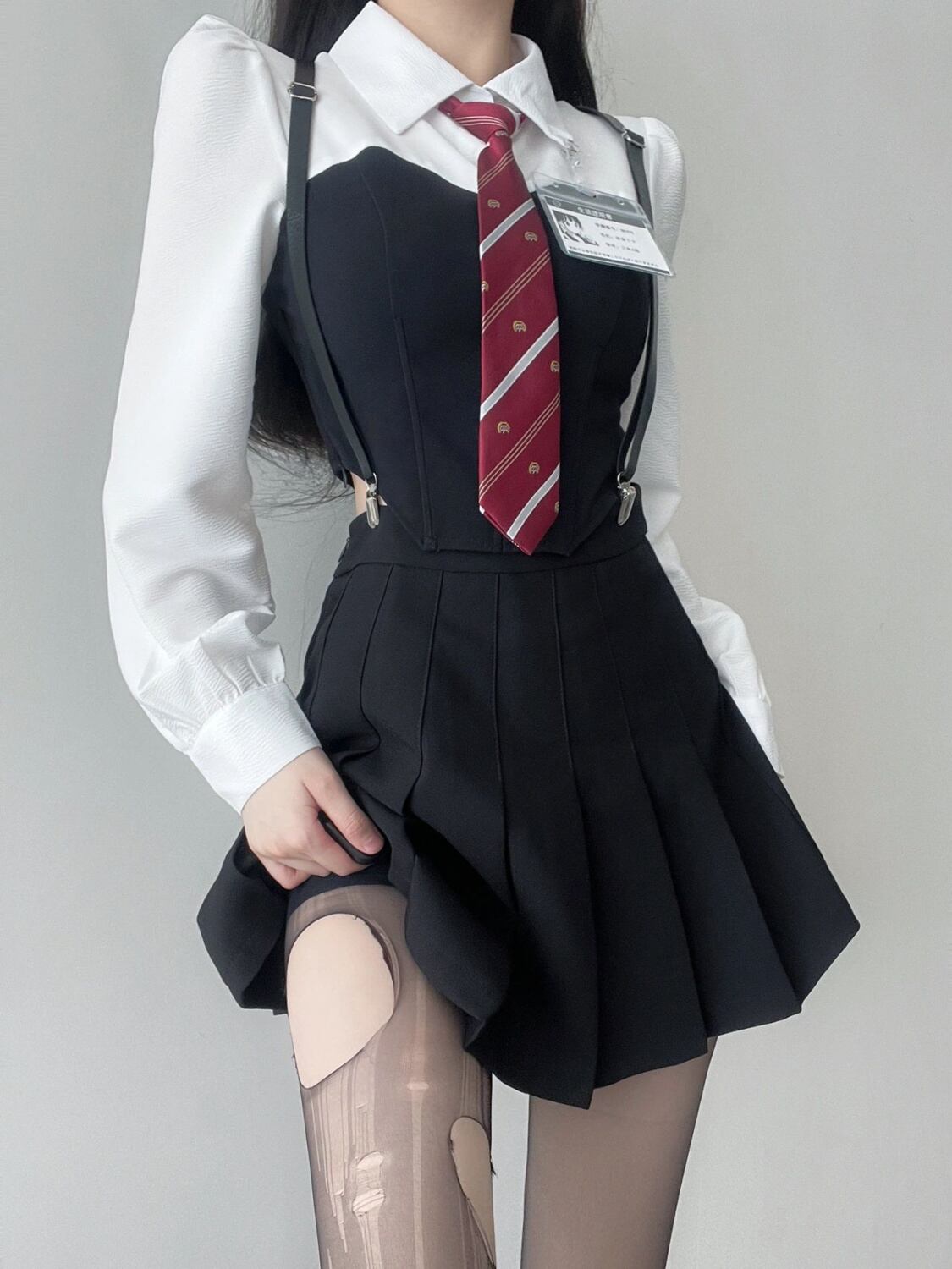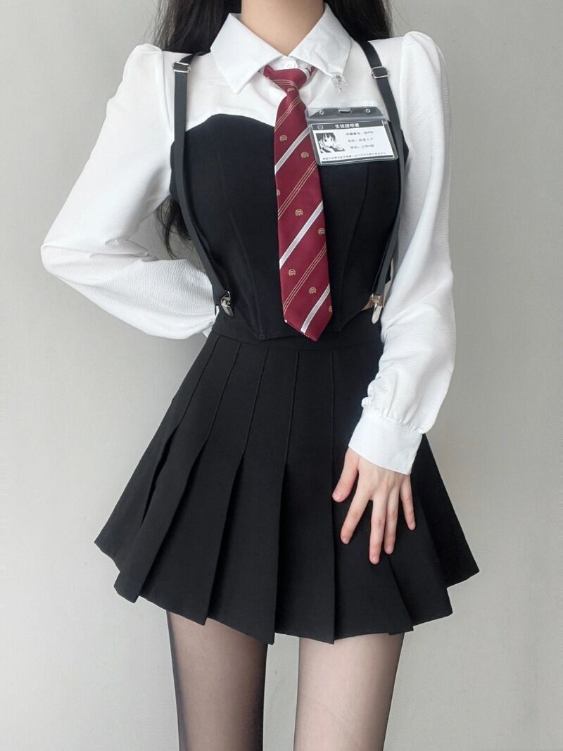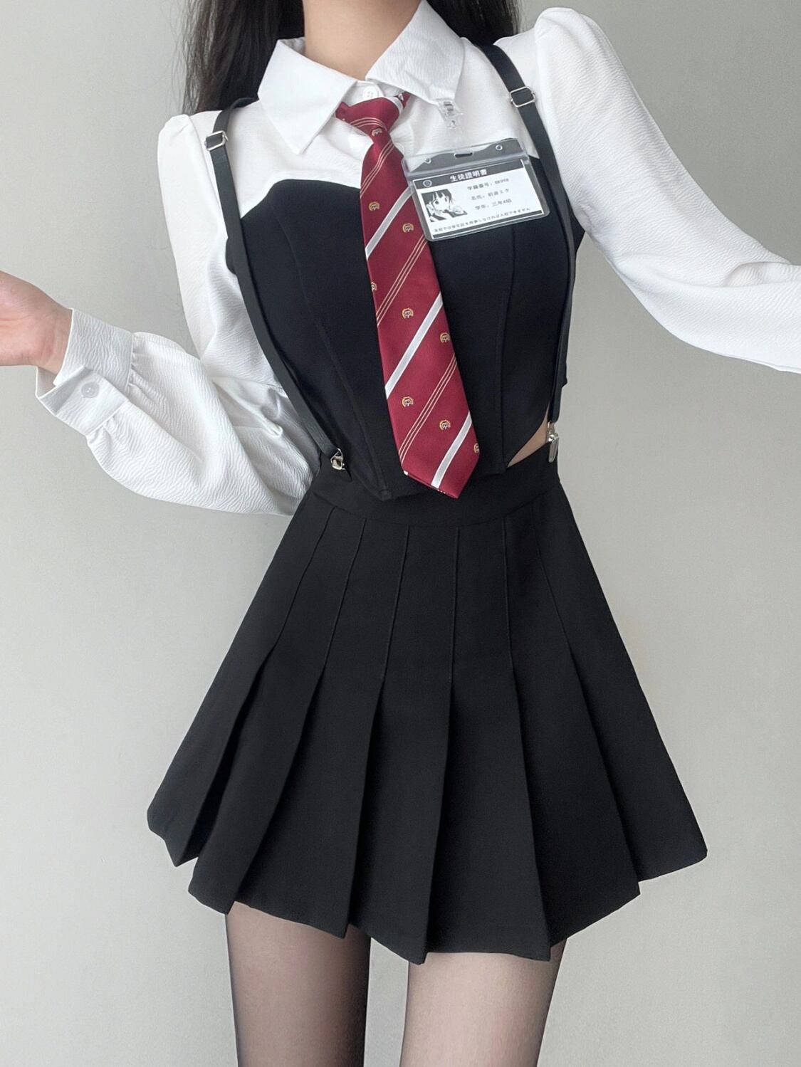 ホットガールズスタイルスーツ春と秋長袖白シャツトップストラップドレスツーピースセット服 ロング ホワイト スプリング 春物 オータム 秋物