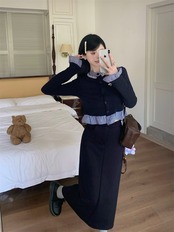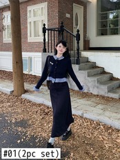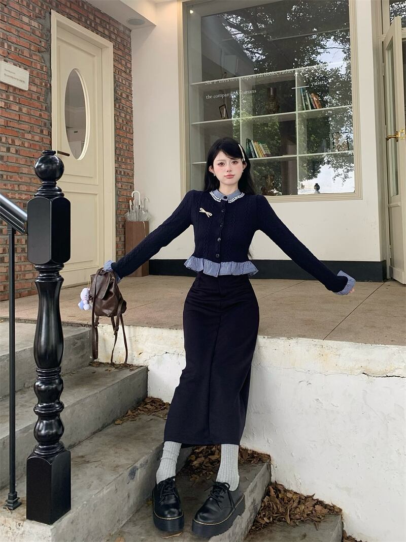 スイートガールスーツ秋スプライス長袖シャツウエストラップヒップロングスカートツーピースセット服 大人ガーリー スウィート キュート カジュアル オータム 秋物