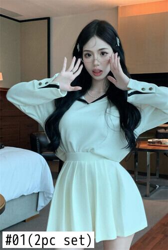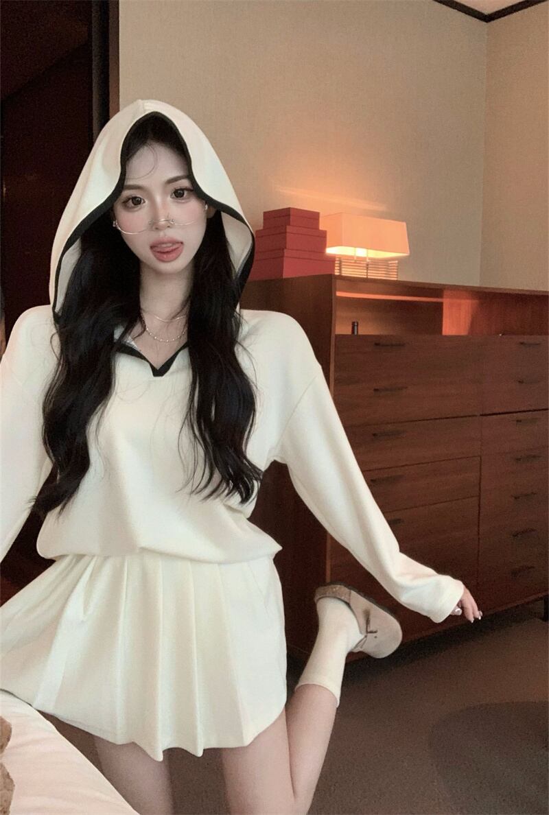 スイートガールスタイルスーツ秋フード付きニットウエスト A ラインプリーツショートスカート 2 点セット服 大人ガーリー スウィート キュート カジュアル オータム 秋物 Aライン