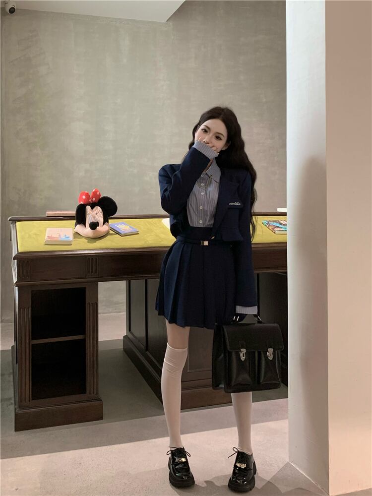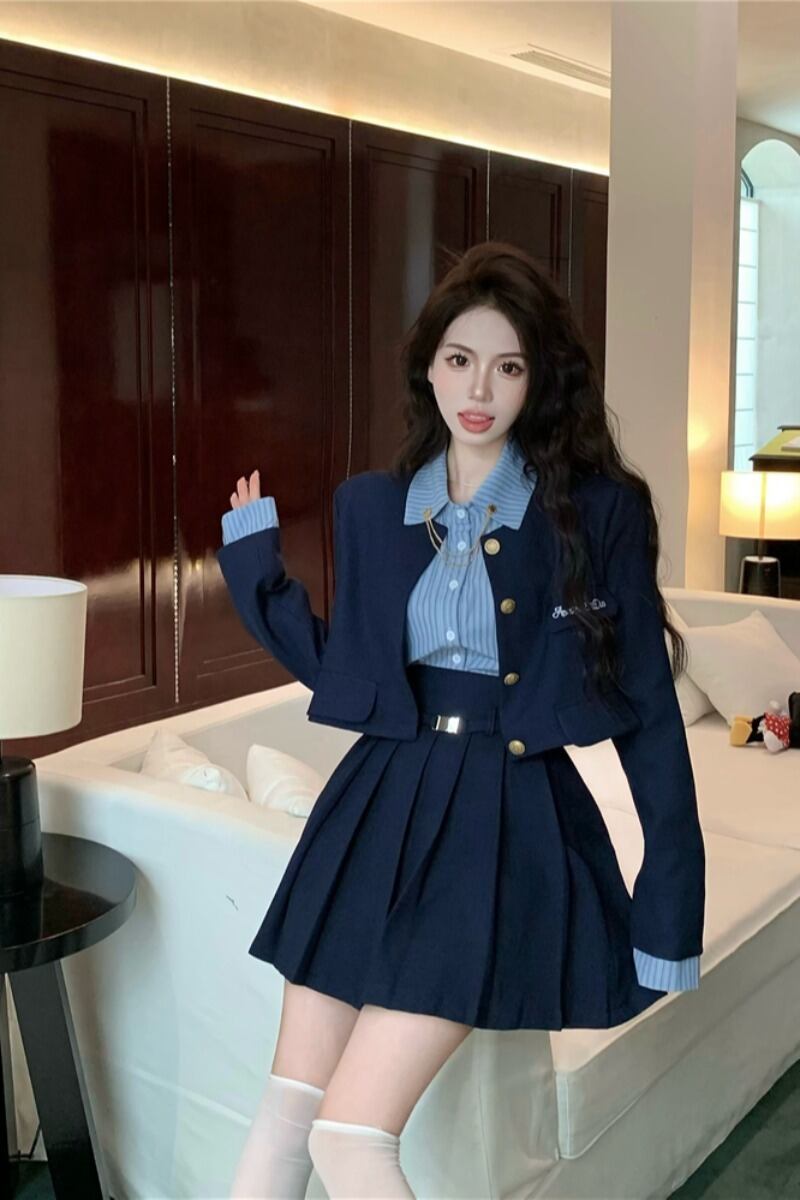 ホットガールスタイルスーツ秋ショートジャケットストライプシャツプリーツスカート 3 点セット服 オータム 秋物