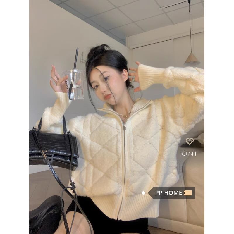 甘いホットガール白ソフトセーター秋厚い緩いターンダウン襟ショートニットカーディガンコート服 ホワイト 大人ガーリー スウィート キュート カジュアル オータム 秋物