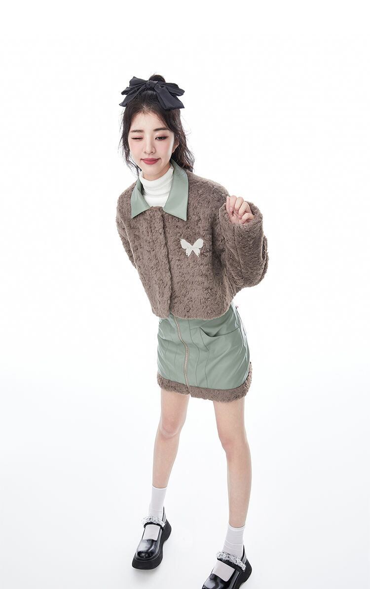 甘いホットガールスーツ秋コーヒーグリーンターンダウン襟フリースコート A ラインミニスカート 2 点セット服 大人ガーリー スウィート キュート カジュアル オータム 秋物 Aライン