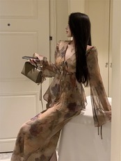 ホットガール純粋セクシースーツ秋花長袖シャツウエストロングスカートツーピースセット服 オータム 秋物 ピュア フラワーデザイン