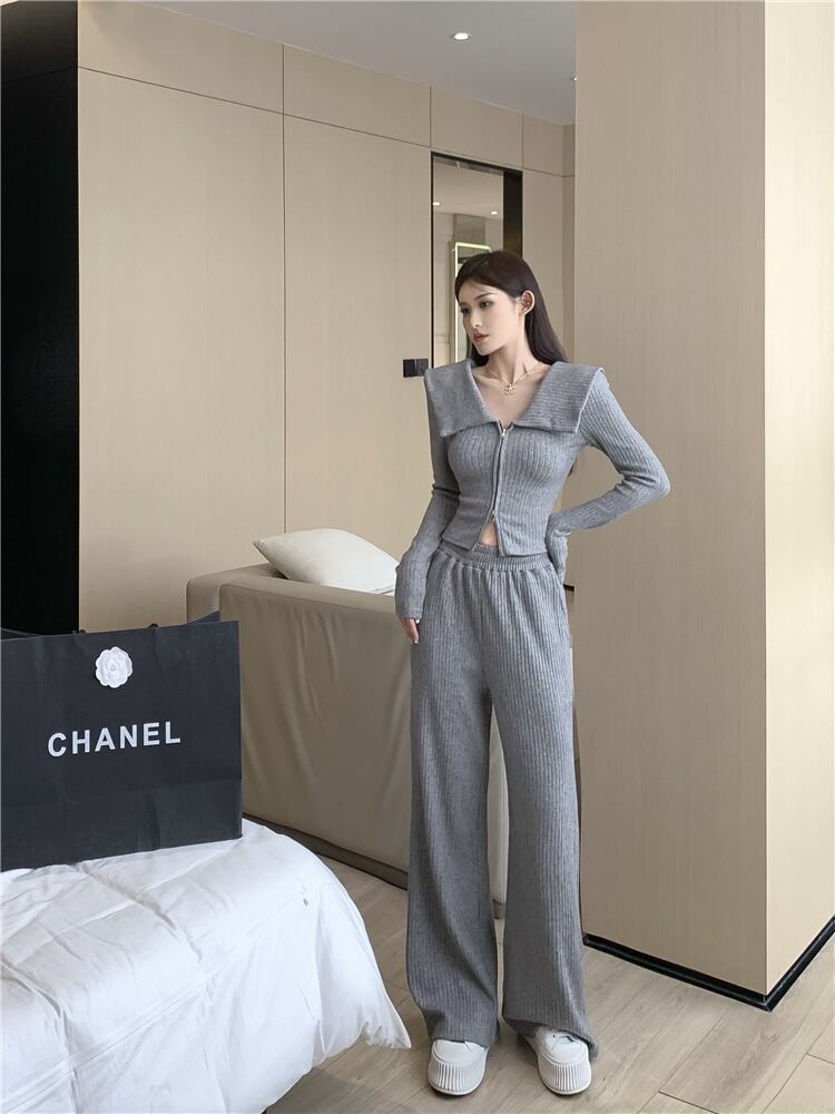 フレンチホットガールスーツ秋スリムフィットターンダウンカラーコートウエストワイドレッグパンツツーピースセット服 オータム 秋物 ワイドパンツ