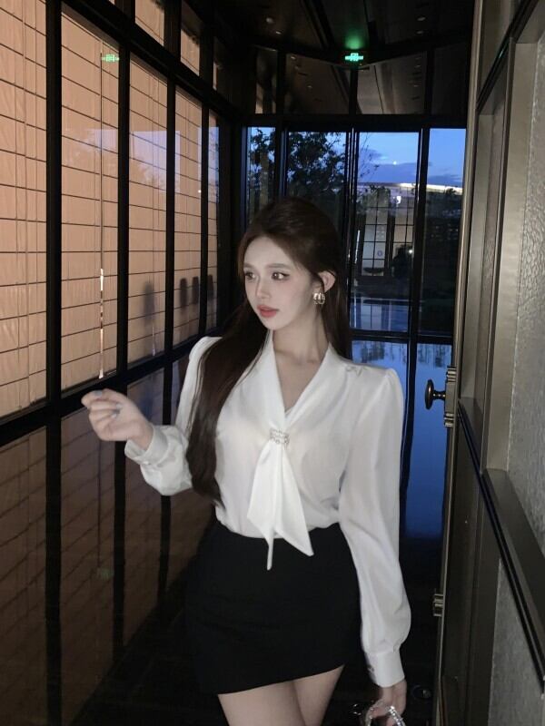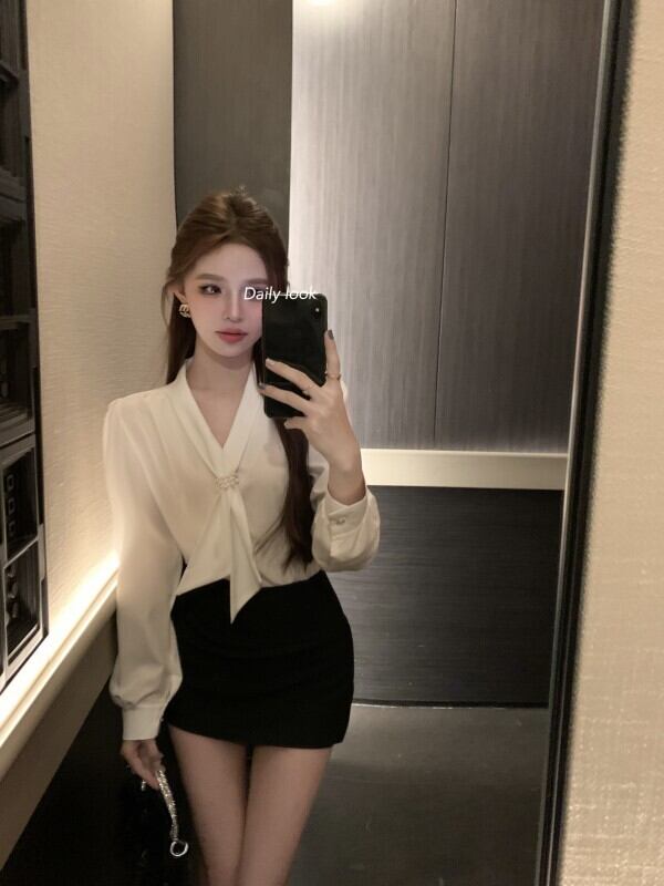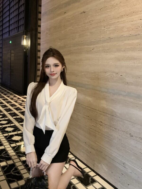 フレンチスタイル甘いホットガール白シャツ秋 V ネック長袖ショートルーズシャツ服 ロング ホワイト 大人ガーリー スウィート キュート カジュアル オータム 秋物 Vネック