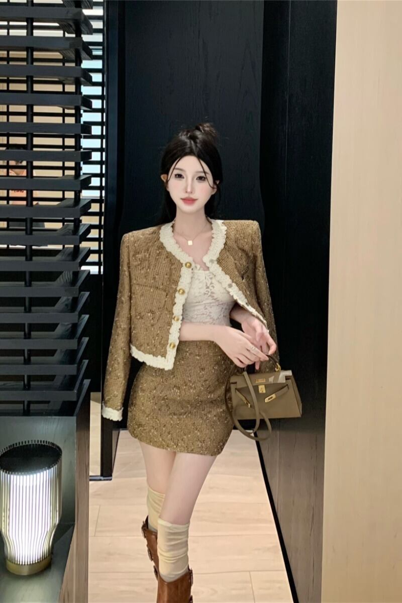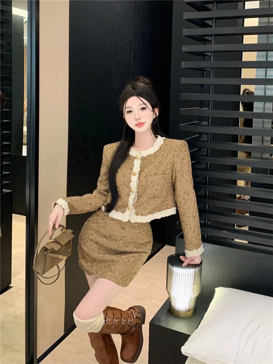 甘いホットガールスーツ秋純粋セクシー O ネックレースコートウエストミニスカート 2 点セット服 大人ガーリー スウィート キュート カジュアル オータム 秋物 Oネック ピュア