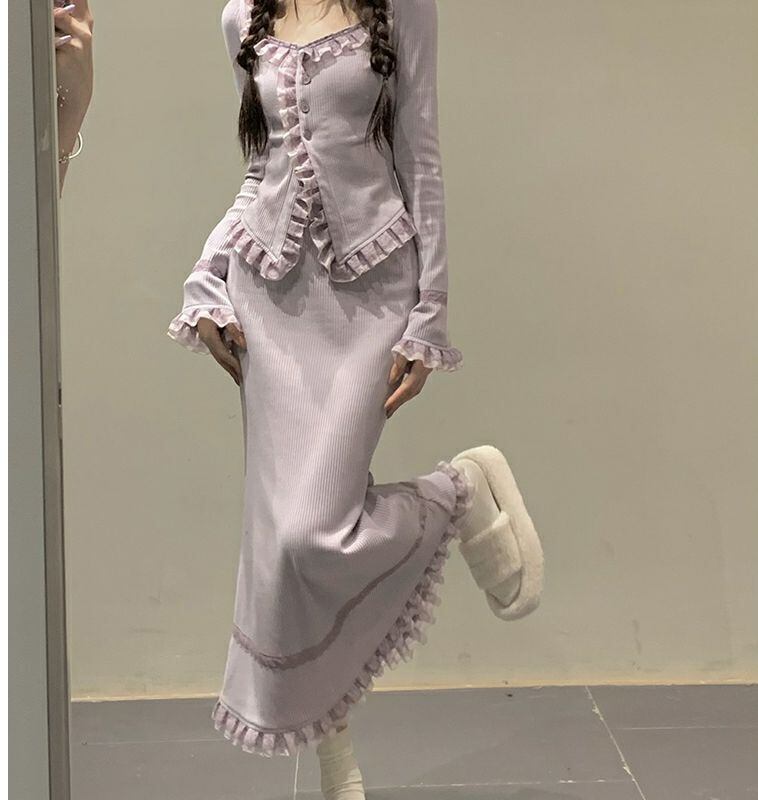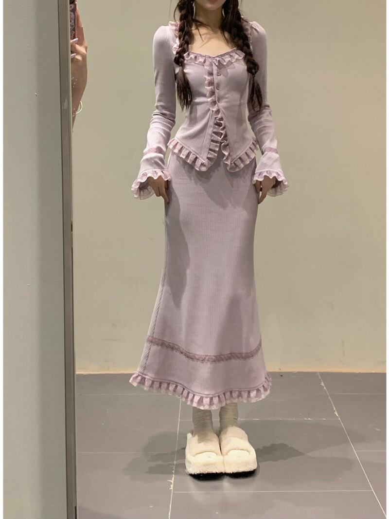 純粋セクシーホットガールスーツ秋スクエアカラーニットカーディガントップマーメイドロングスカート 2 点セット服 オータム 秋物 スクウェア