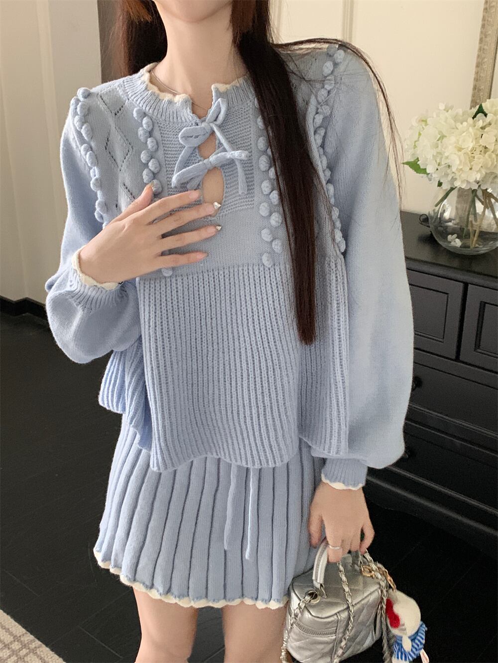 スイートガールスーツ秋 3D 刺繍ピットストライプブルーニットプルオーバーウエストミニスカート 2 点セット服 大人ガーリー スウィート キュート カジュアル オータム 秋物