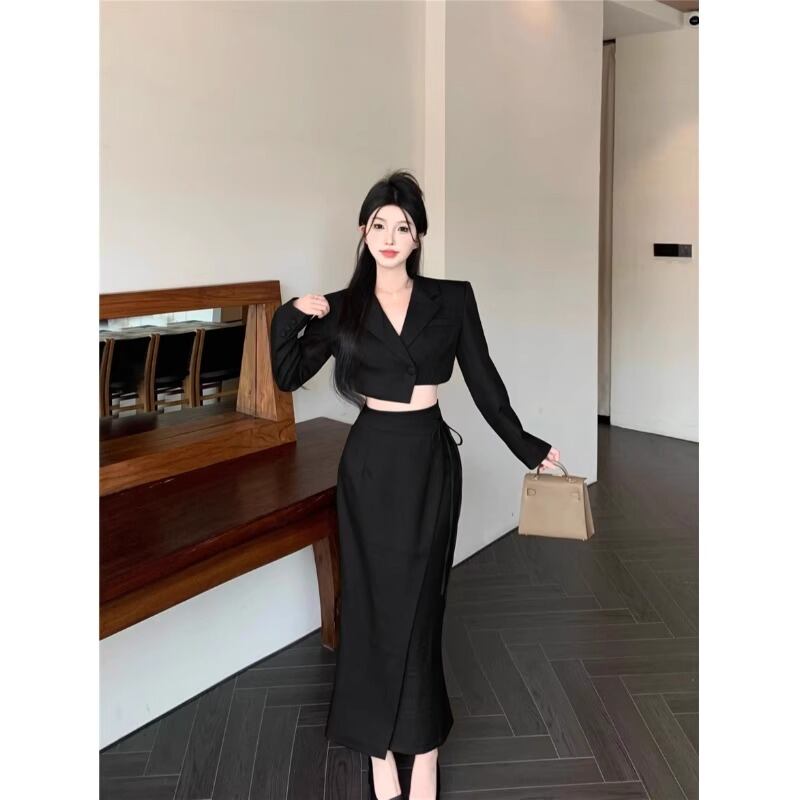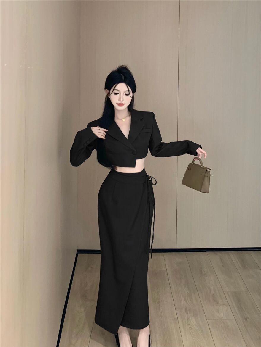 ホットガールスーツ秋不規則長袖ショートトップウエストロングスカートツーピースセット服 オータム 秋物