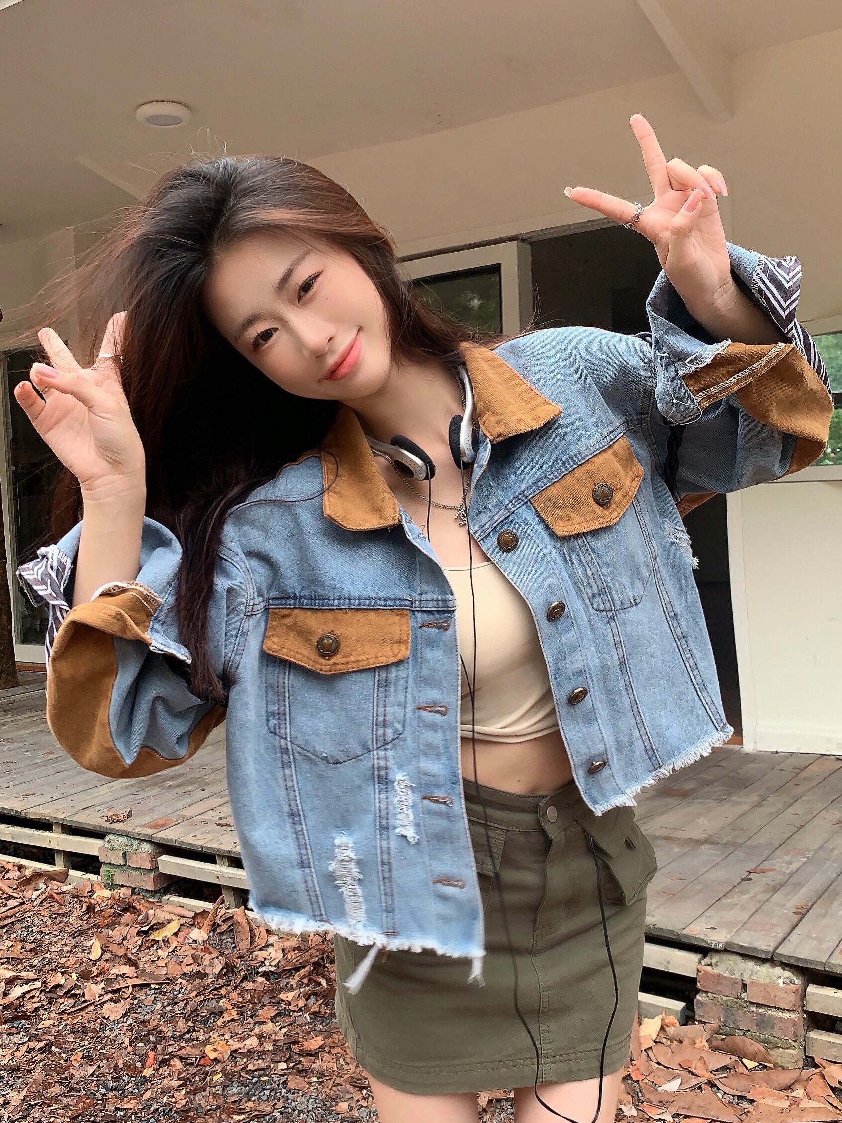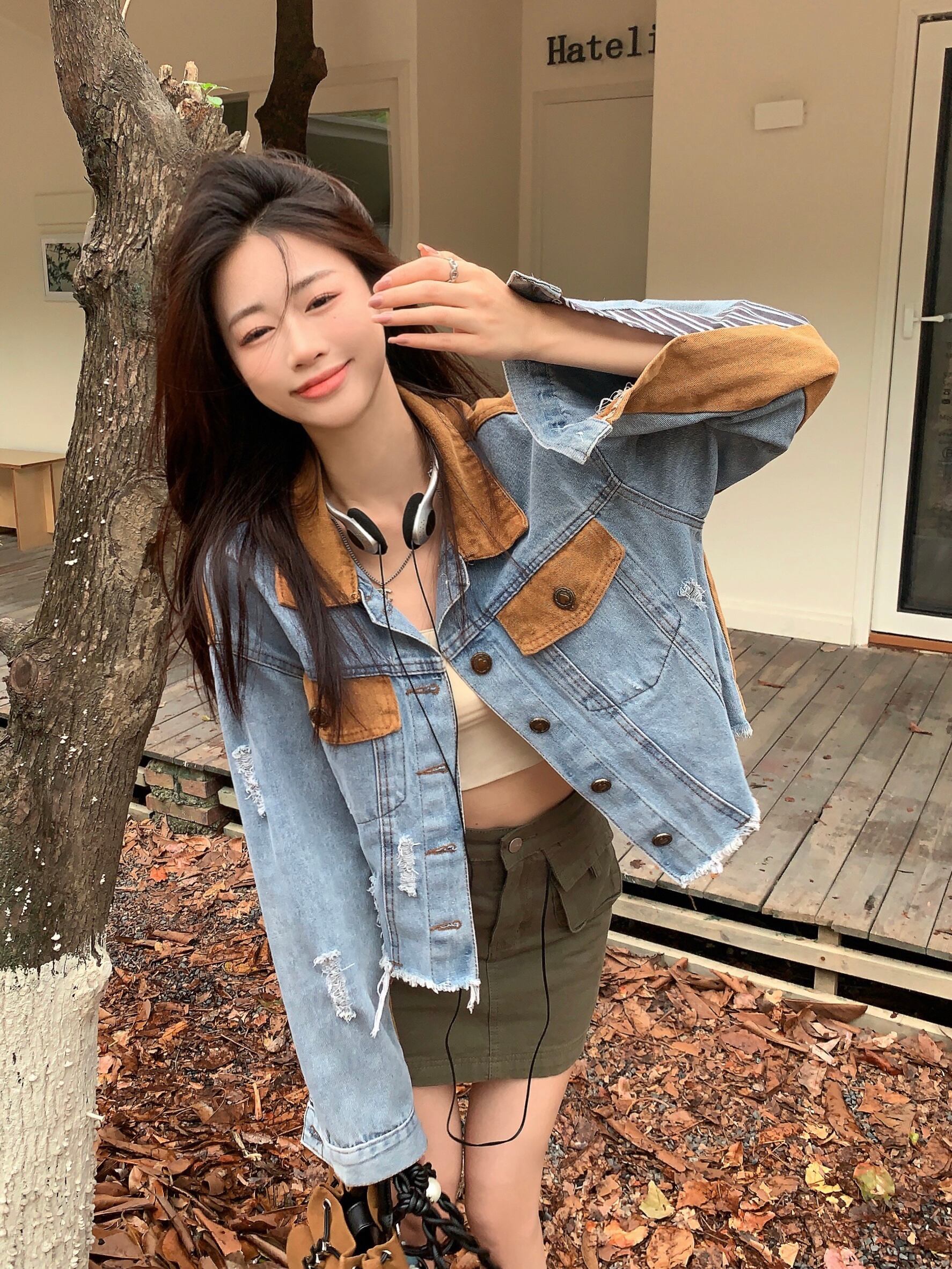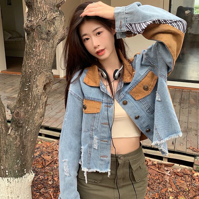 ホットガールレトロ対照的カラー電話長袖デニムジャケット秋パッチワークルーズショートトップ服 ロング オータム 秋物