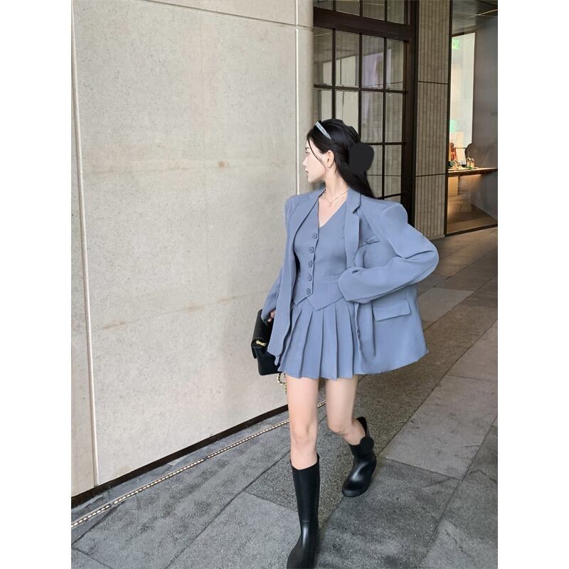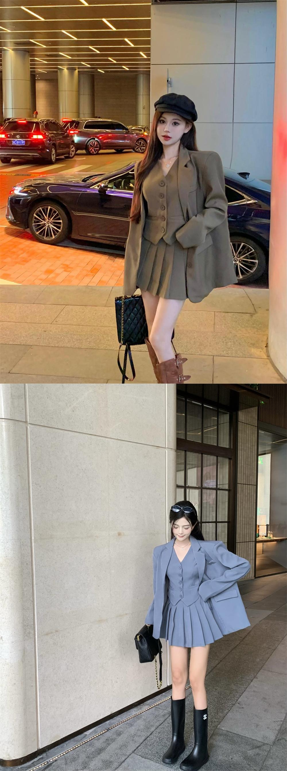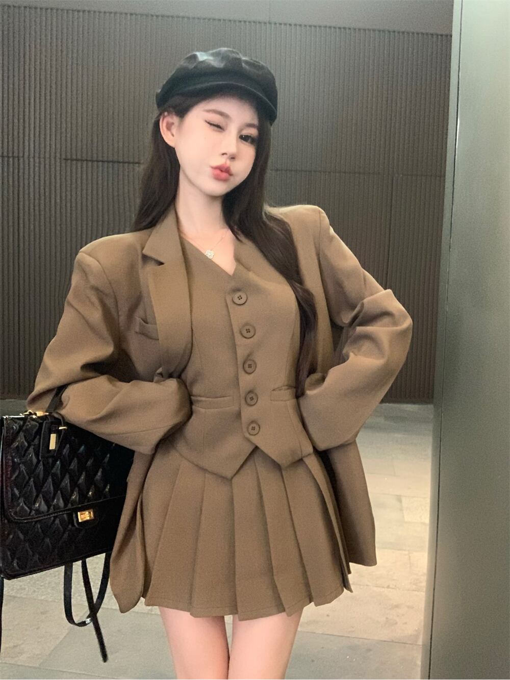 Sweet Girl プレッピー スタイル スーツ レディース 秋 ノースリーブ ベスト タンクトップ ウエスト プリーツ スカート ルーズ コート 3 点セット 大人ガーリー スウィート キュート カジュアル オータム 秋物