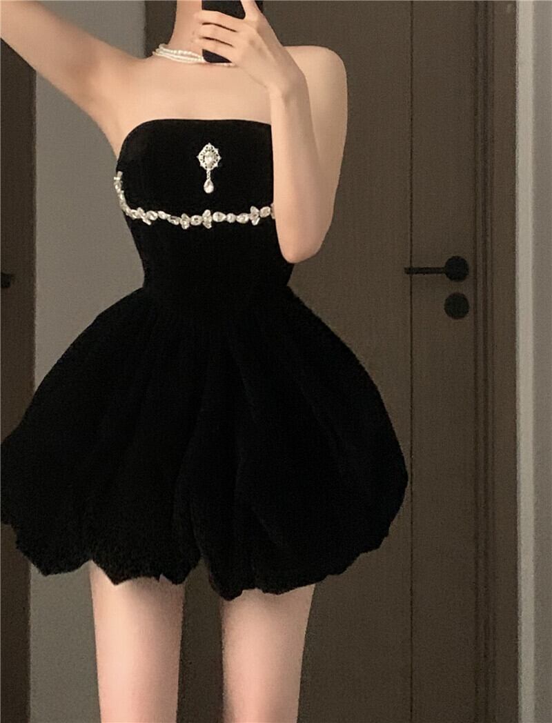 スウィートガールラインストーンブラックストラップレスドレス夏ダイヤモンドチェーンウエスト花つぼみショートドレス服 大人ガーリー キュート カジュアル サマー 夏物 フラワーデザイン