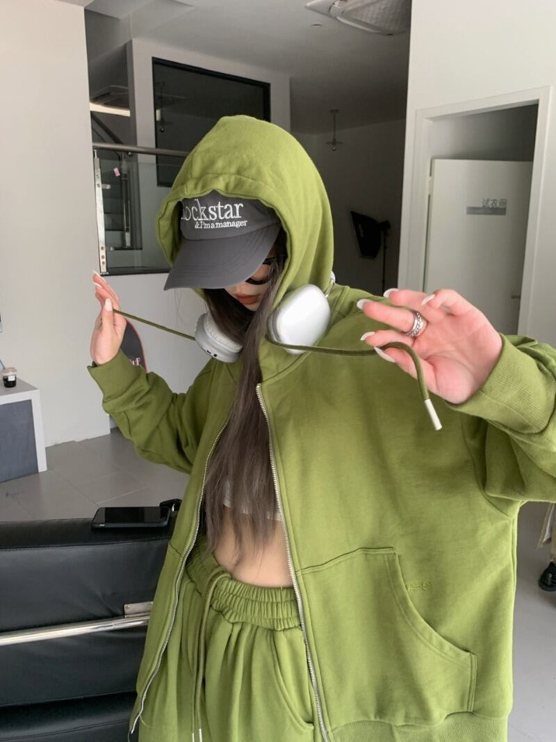 ホットガールスーツ秋ルーズフード付きジッパー長袖コート弾性ワイドレッグパンツツーピースセット服 ロング エラスティック 伸縮 オータム 秋物 ワイドパンツ