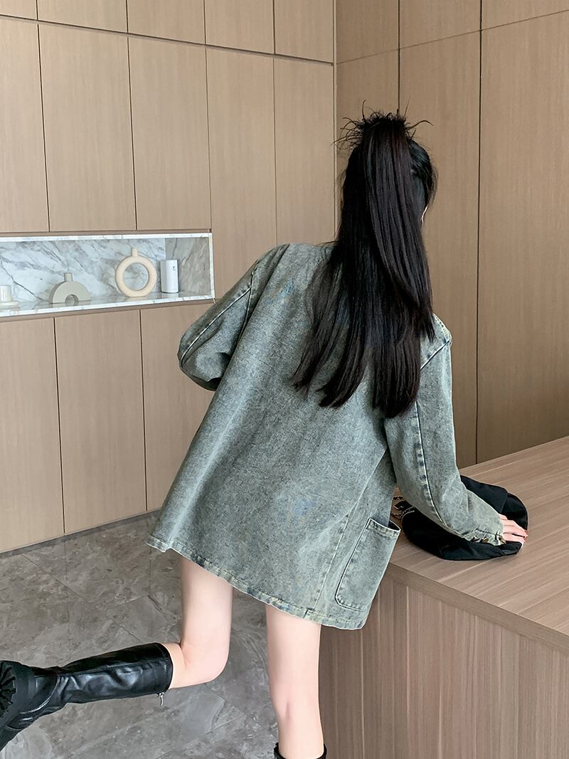 アメリカレトロスタイルデニムジャケット秋ターンダウン襟ルーズウォッシュ長袖コート服 ロング オータム 秋物