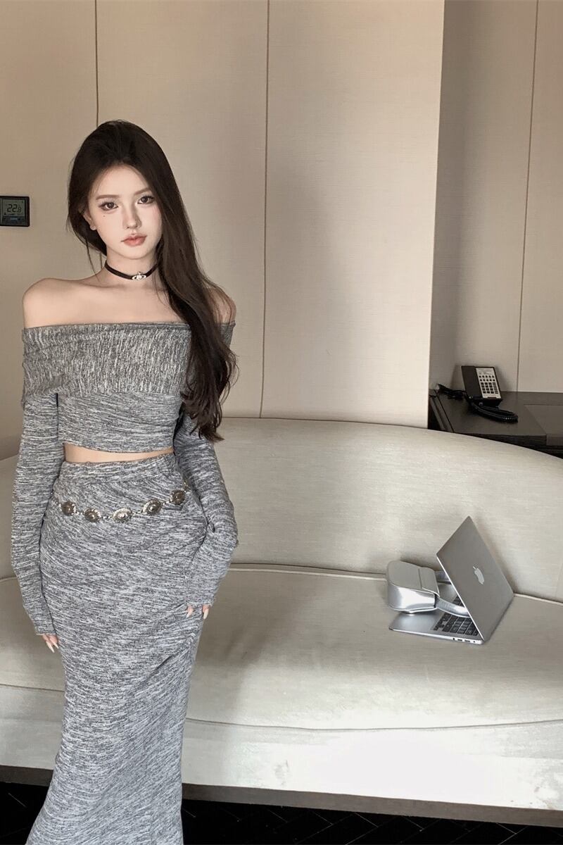 フレンチスイートガールスーツ秋オフショルダートップウエストラップヒップロングスカートツーピースセット服 大人ガーリー スウィート キュート カジュアル オータム 秋物