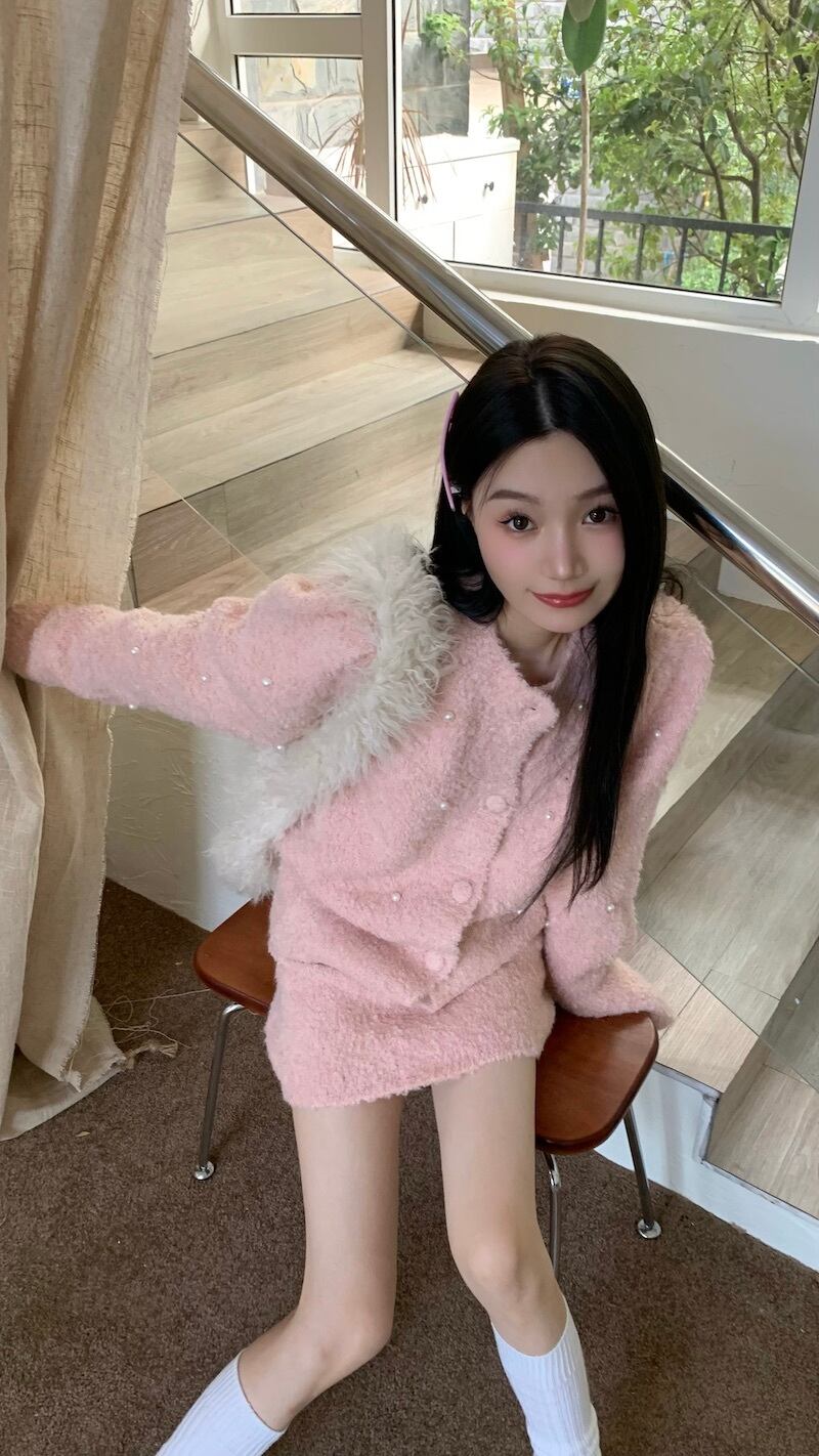 スウィートガールスーツ レディース ピンク 長袖ニットコート ウエストラップヒップショートスカート 2点セット服 ロング 大人ガーリー キュート カジュアル