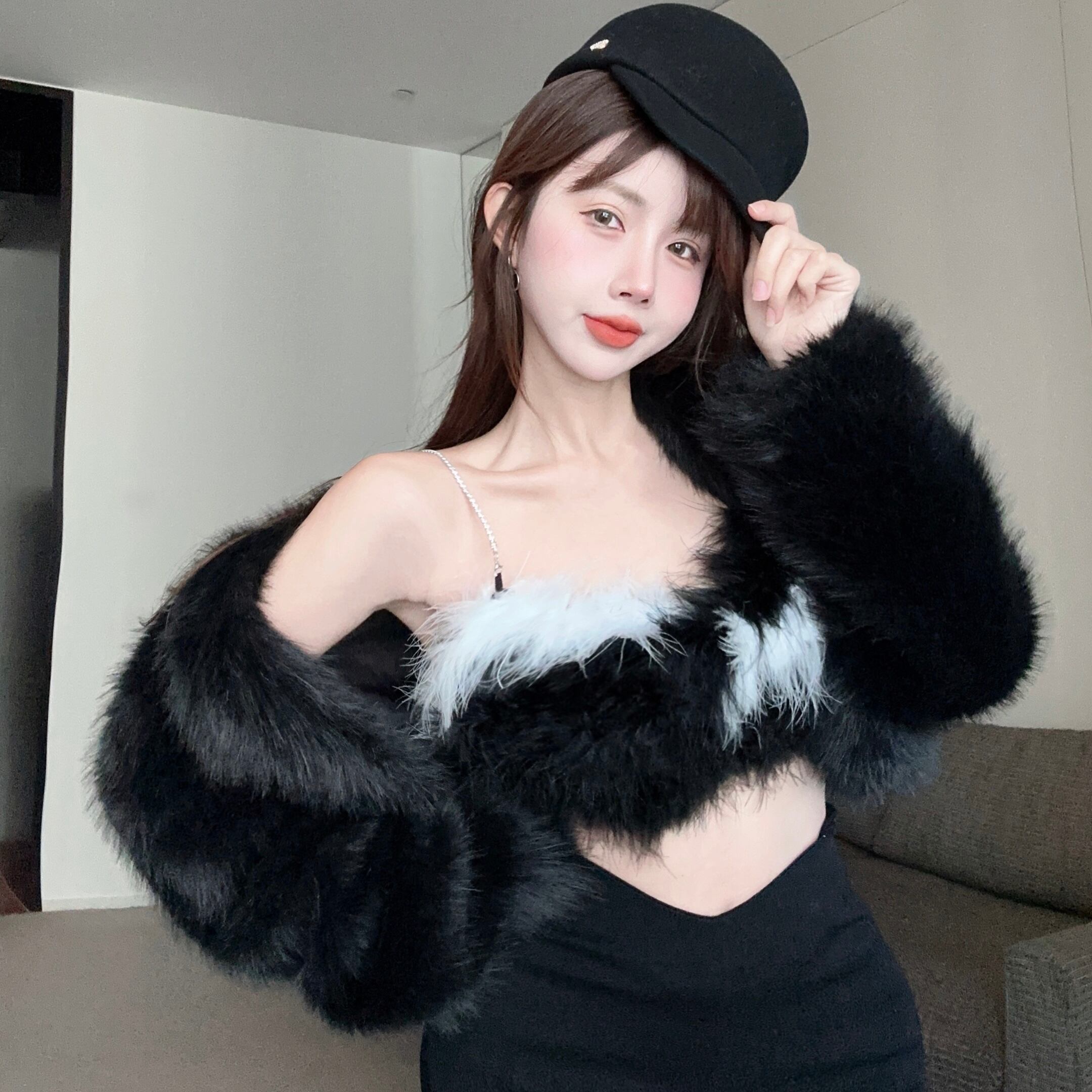 甘いホットガール純粋セクシージッパーぬいぐるみストラップキャミソール秋ショートスリムフィットフェイクファーベスト服 大人ガーリー スウィート キュート カジュアル オータム 秋物 ピュア