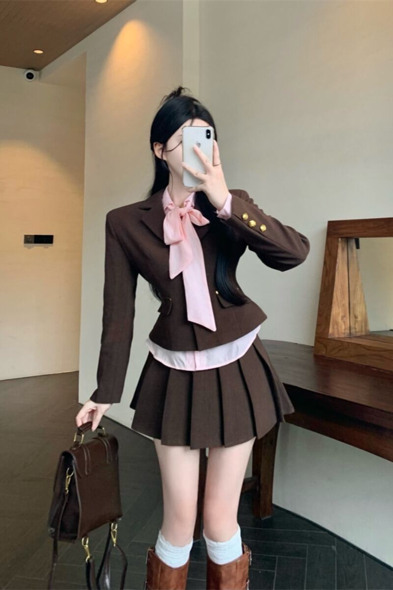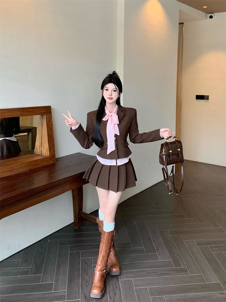 メイラード レトロ プレッピー スタイル スーツ レディース 冬スーツ コート ウエスト プリーツ ミニスカート 2 点セット服 ウィンター 冬物