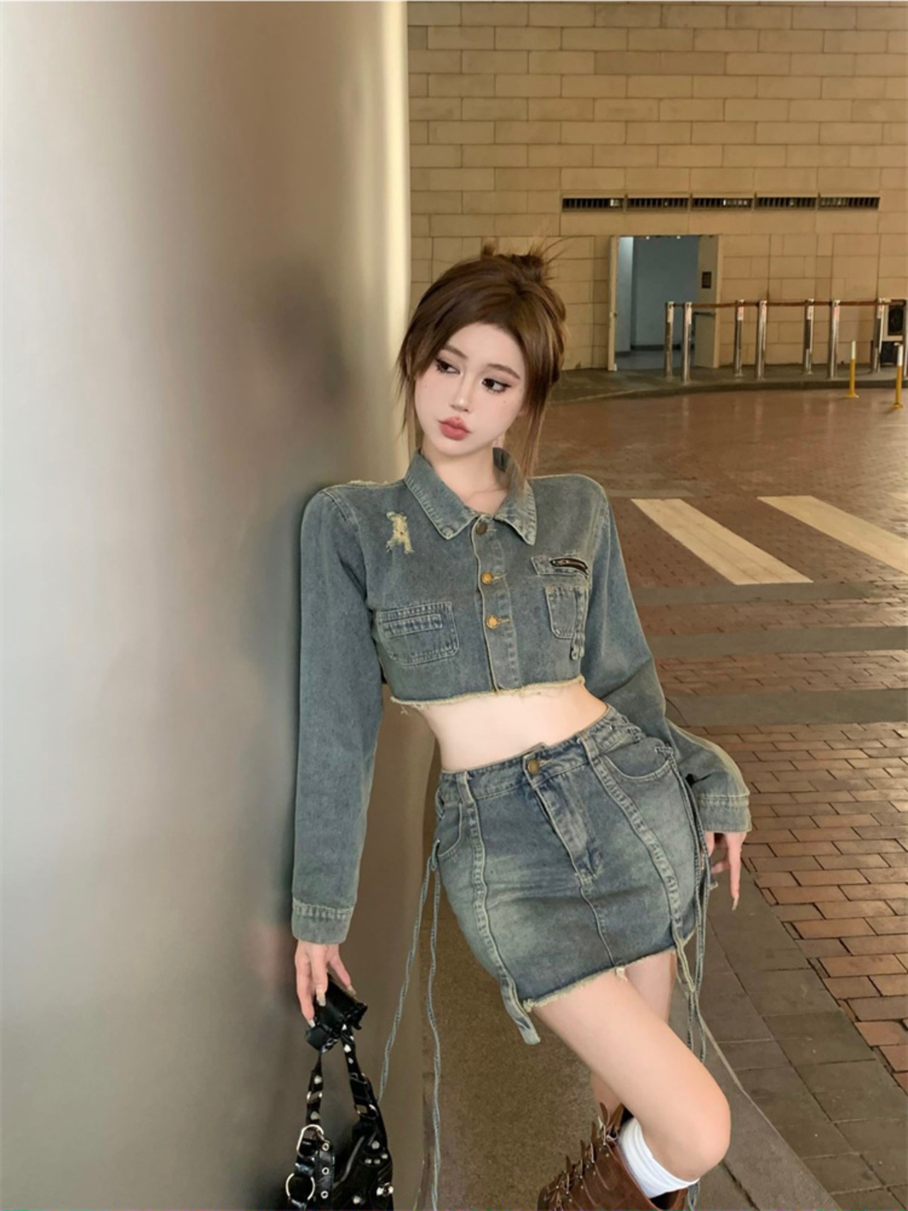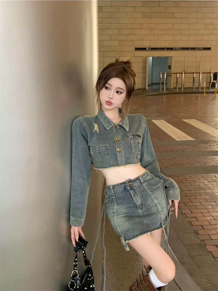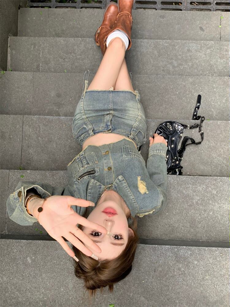 甘いホットガールレトロスーツ秋デニムコートウエストラップヒップミニスカートツーピースセット服 大人ガーリー スウィート キュート カジュアル オータム 秋物