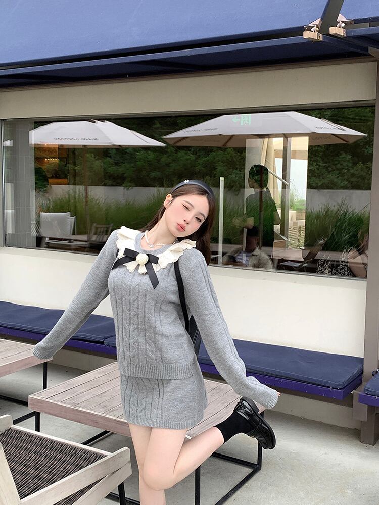 レトロスタイルスーツ秋 O ネックレースネクタイセーターウエストスカート 2 点セット服 オータム 秋物 Oネック