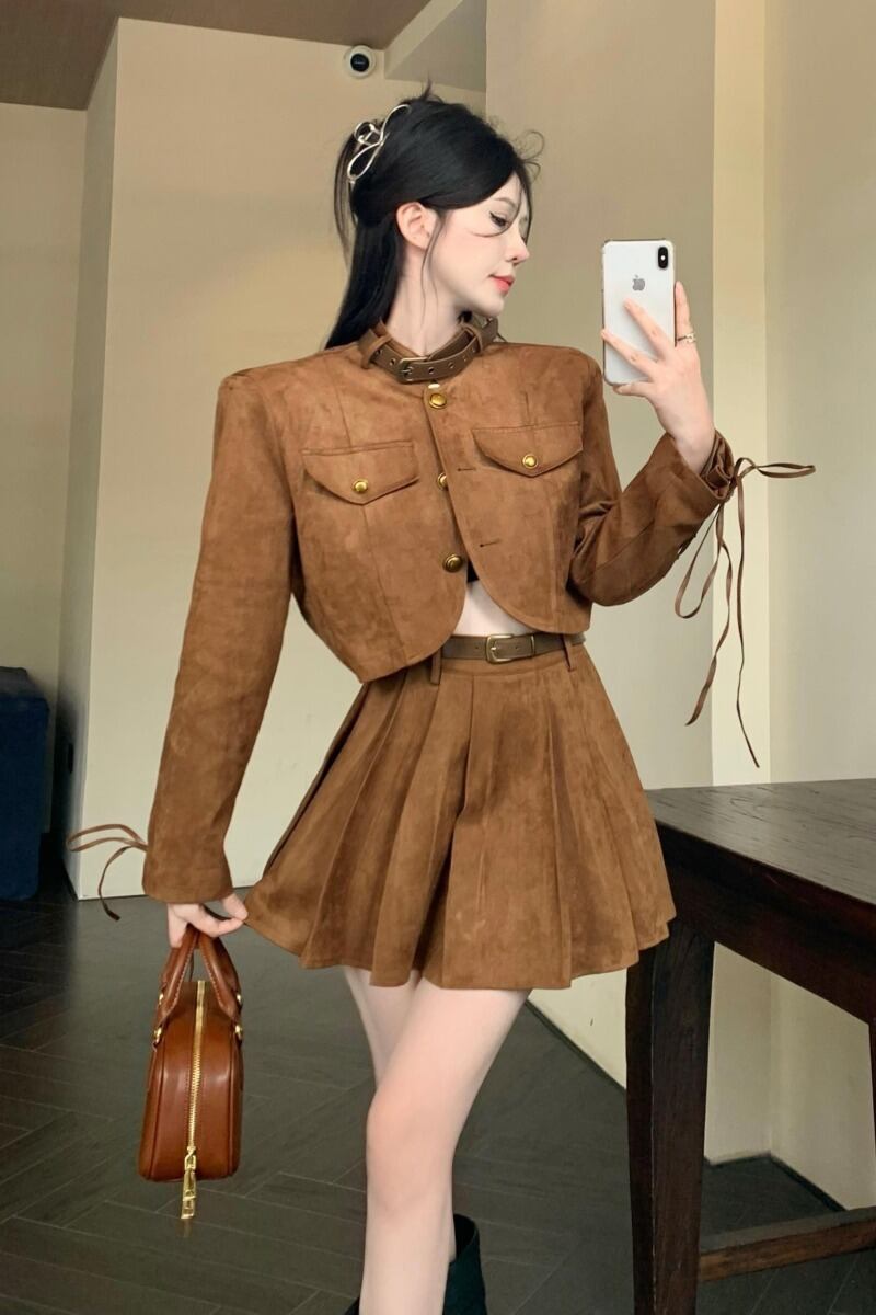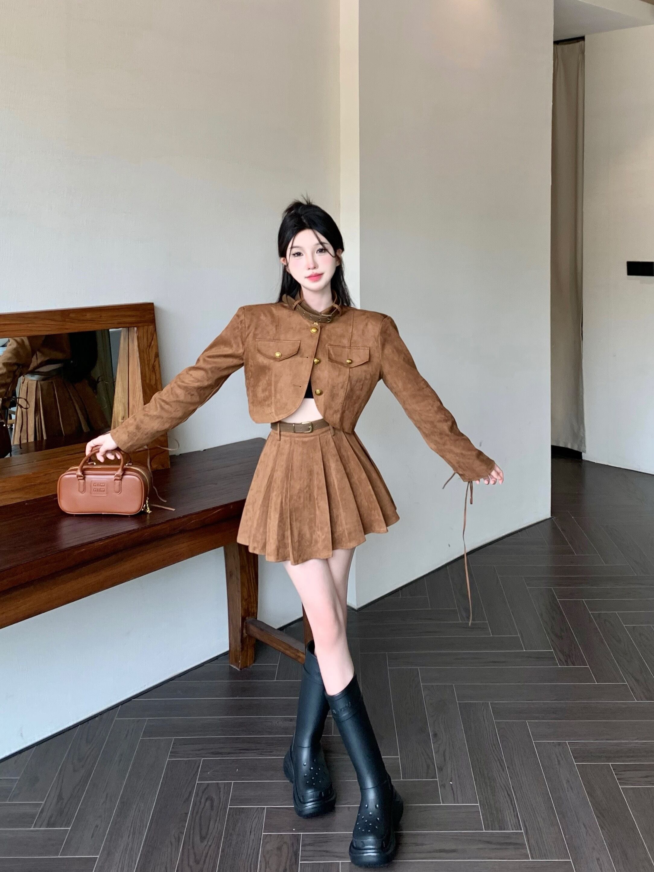 French Sweet Girl スーツ レディース 秋 スタンドカラー スエード バイク ジャケット コート ウエスト プリーツ スカート 2点セット スウェード 大人ガーリー スウィート キュート カジュアル オータム 秋物