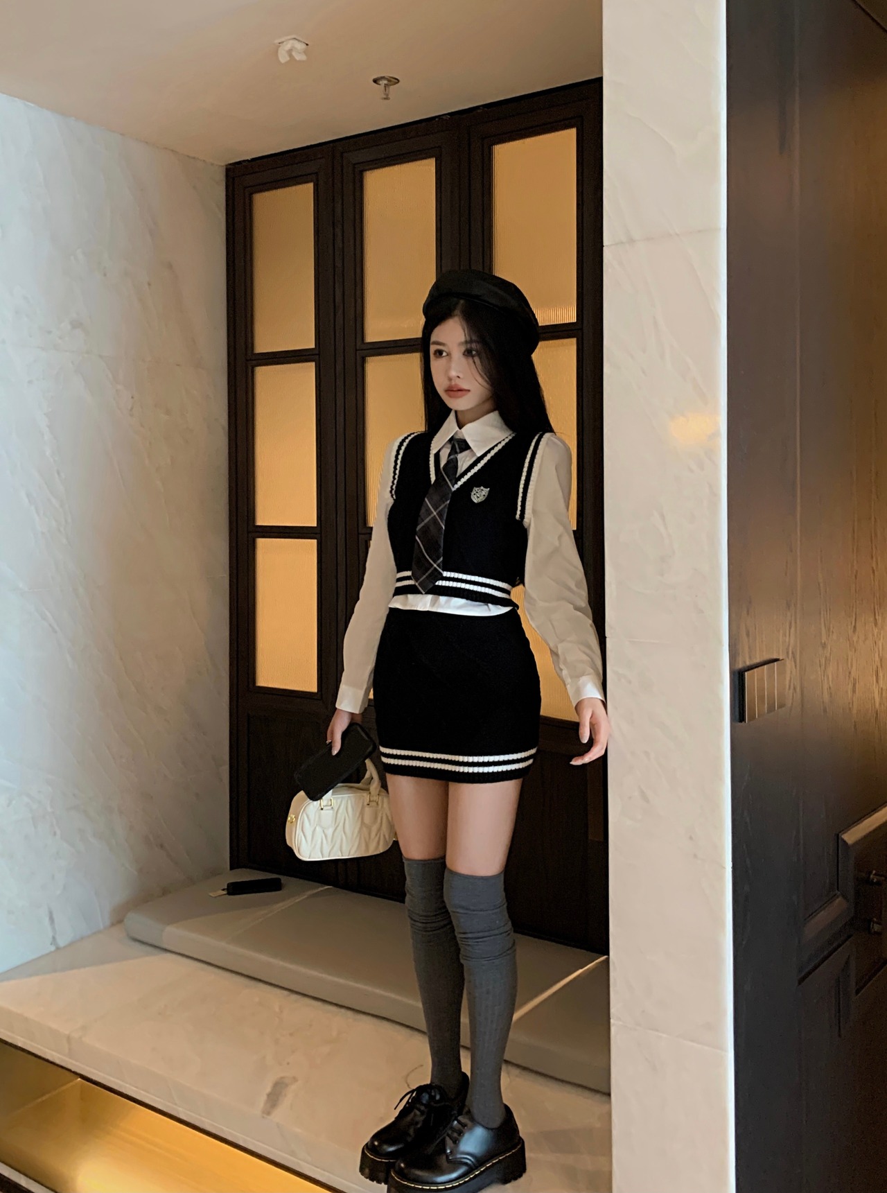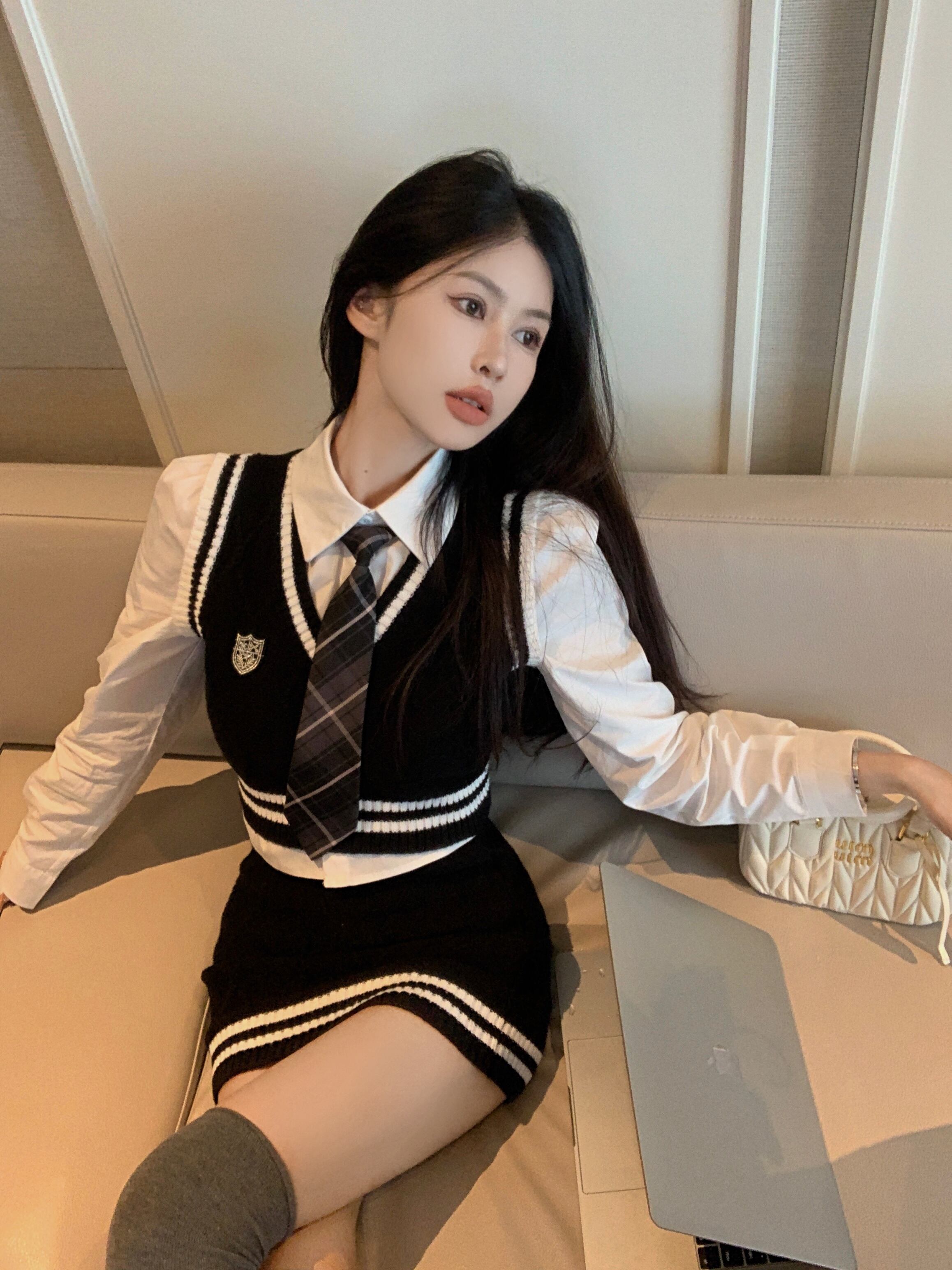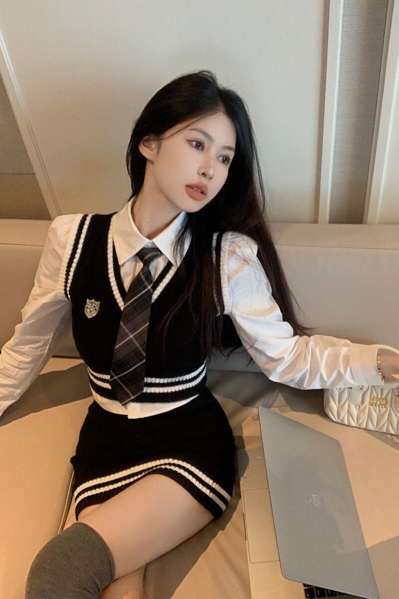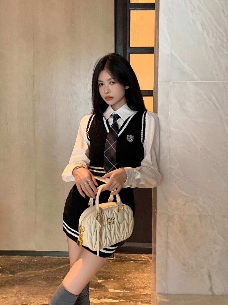スイートガールスタイルスーツ秋 V ネックニットタンクトップ長袖シャツミニスカート 3 点セット服 ロング 大人ガーリー スウィート キュート カジュアル オータム 秋物 Vネック