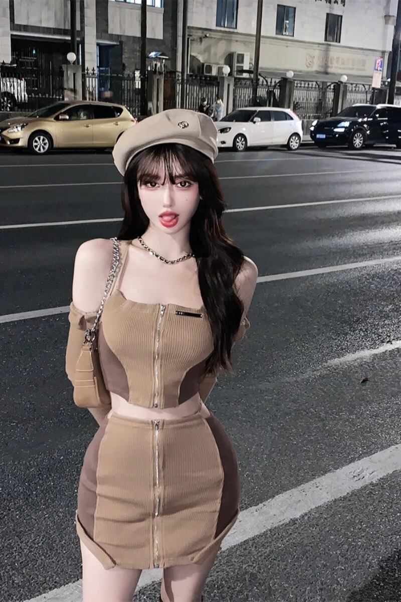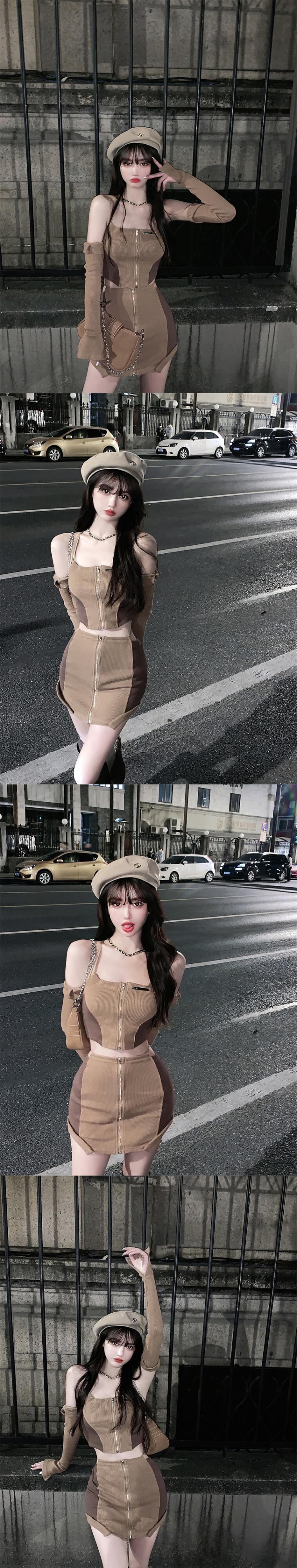メイラードスタイルセクシースーツ秋オフショルダーショートストラップトップと袖ミニスカートツーピースセット服 オータム 秋物