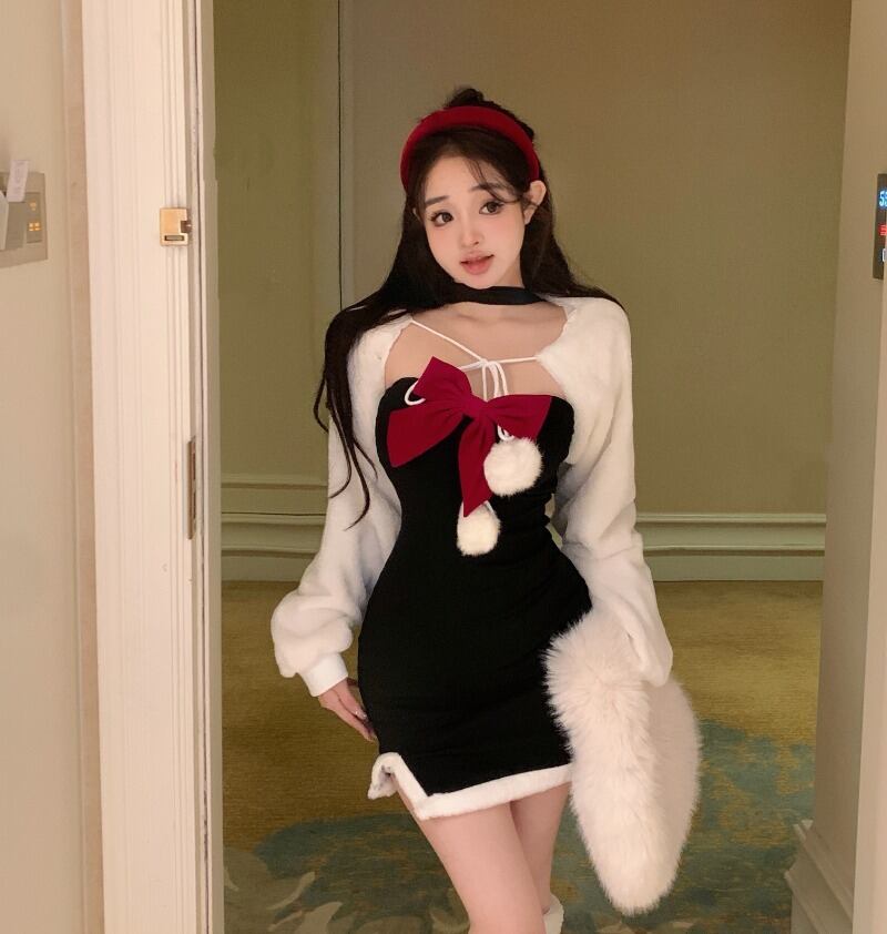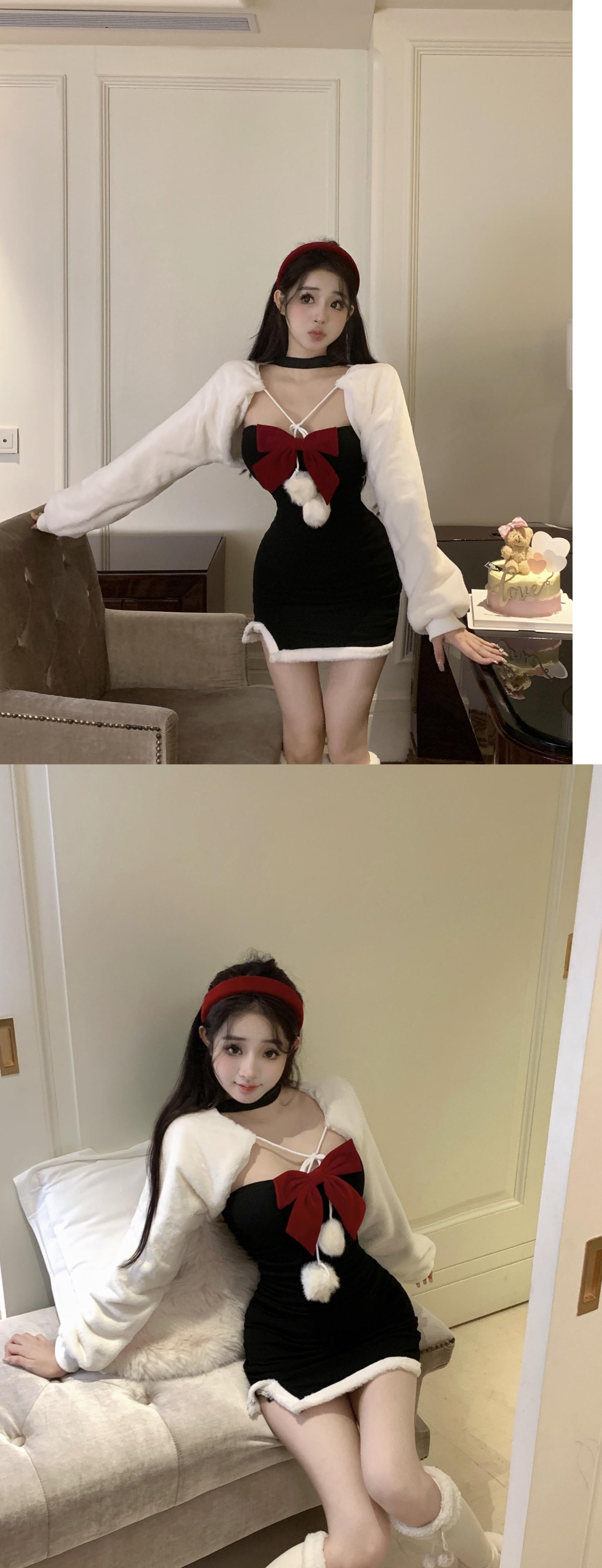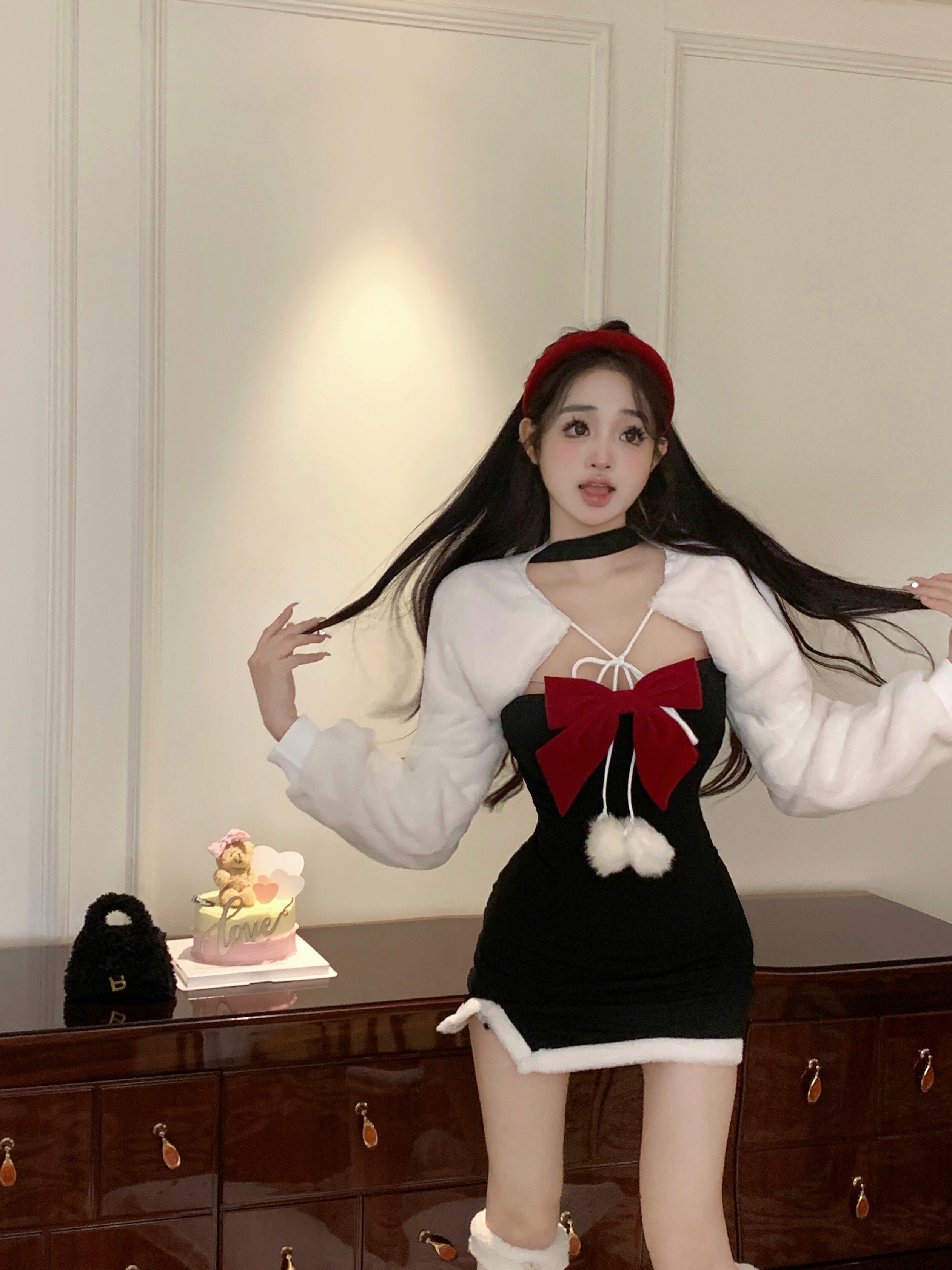 甘いホットガールスーツ冬ショートショルダーコート黒スリムフィットボウストラップショートドレスツーピースセット服 ブラック リボン 大人ガーリー スウィート キュート カジュアル ウィンター 冬物