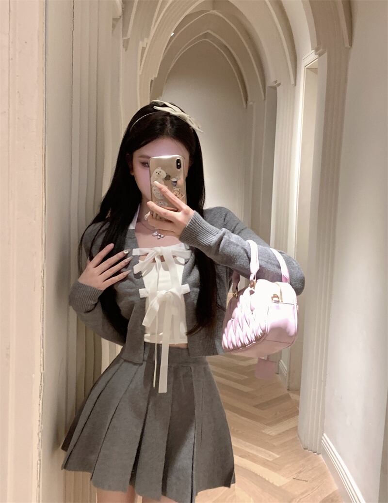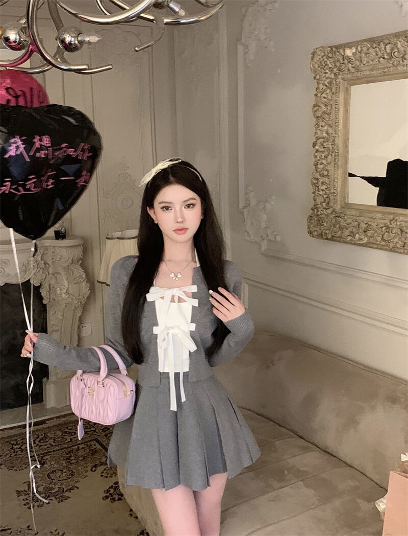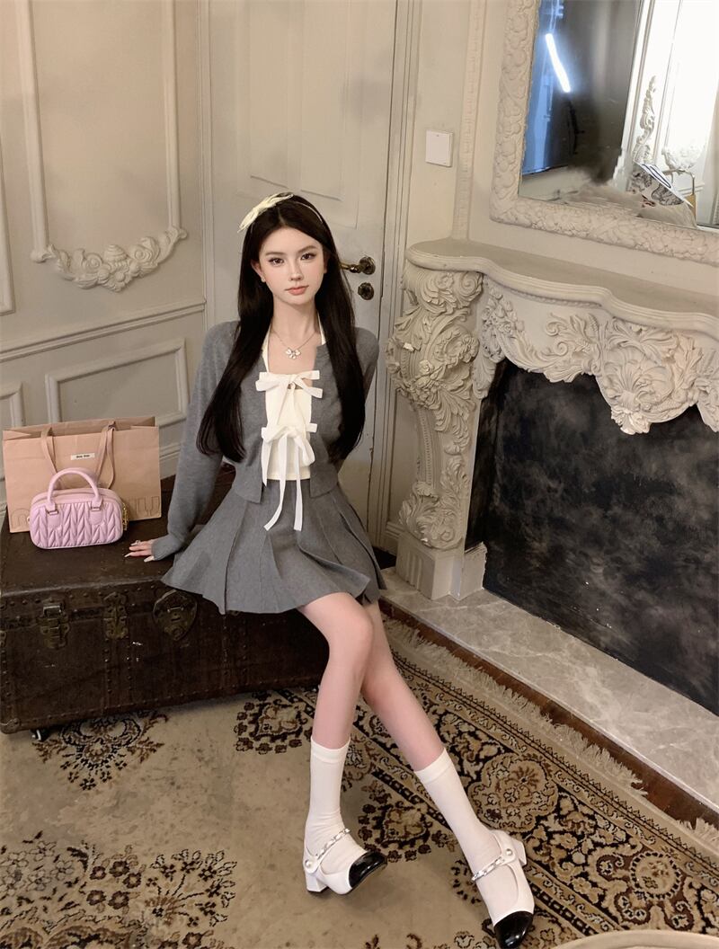 スイートガールスーツ レディース 秋 蝶ネクタイ カーディガン 万能ウエスト プリーツスカート ツーピースセット 服 リボン 大人ガーリー スウィート キュート カジュアル オータム 秋物