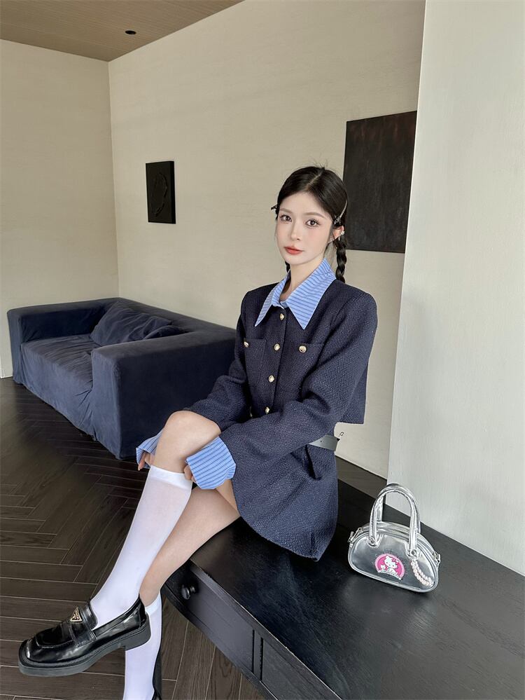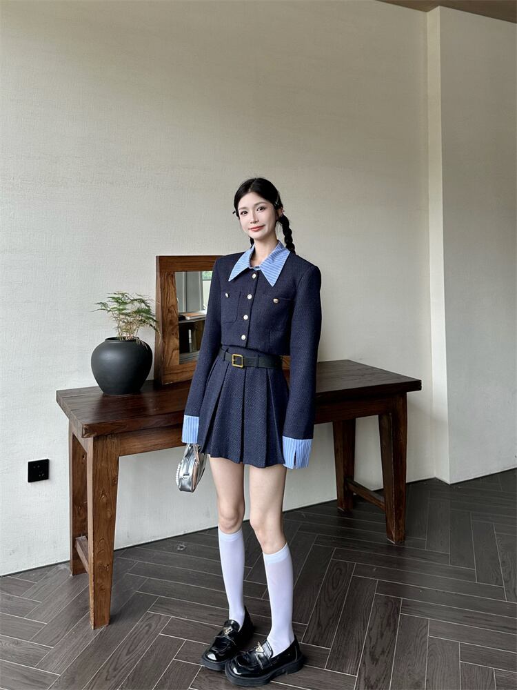 フレンチスイートホットガールスーツ秋ポロカラーパネルコートAラインプリーツミニスカートツーピースセット服 大人ガーリー スウィート キュート カジュアル オータム 秋物