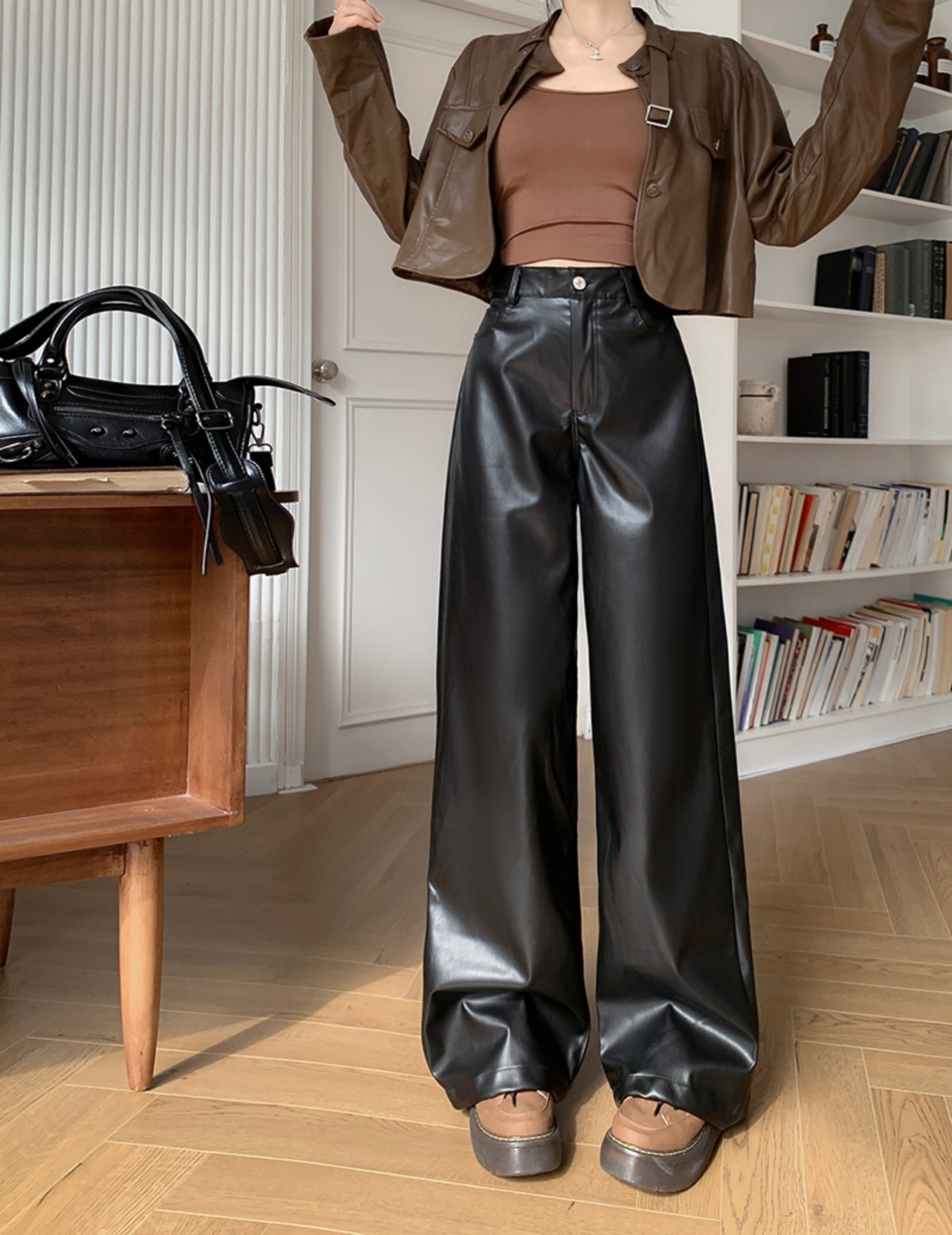 レトロホットガールブラックウエストレザーパンツ秋多用途ストレートワイドレッグロングパンツ服 オータム 秋物 ワイドパンツ