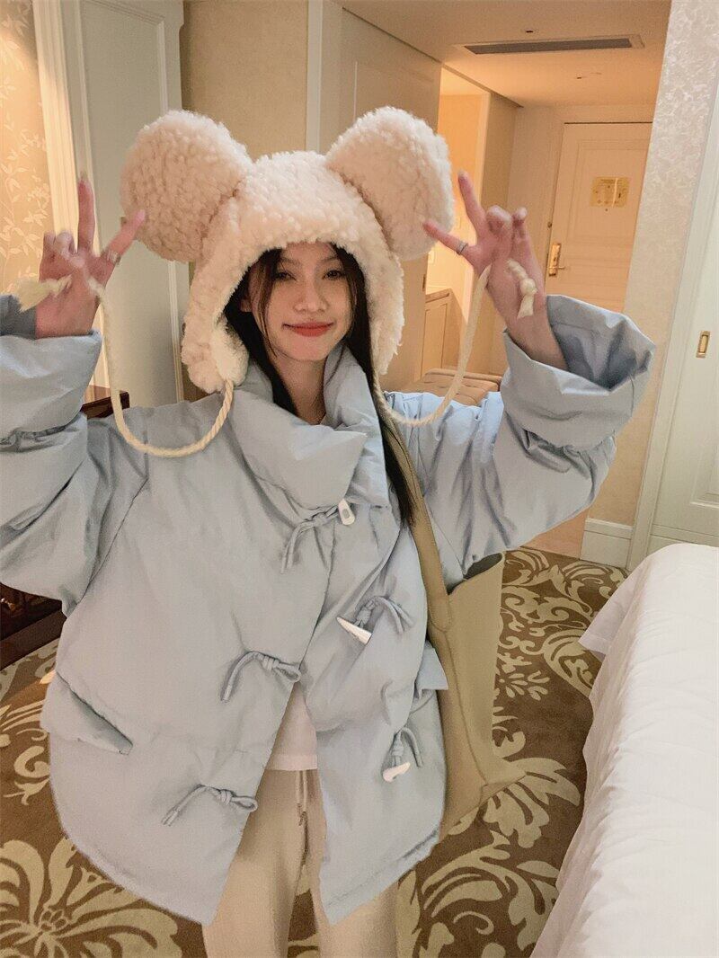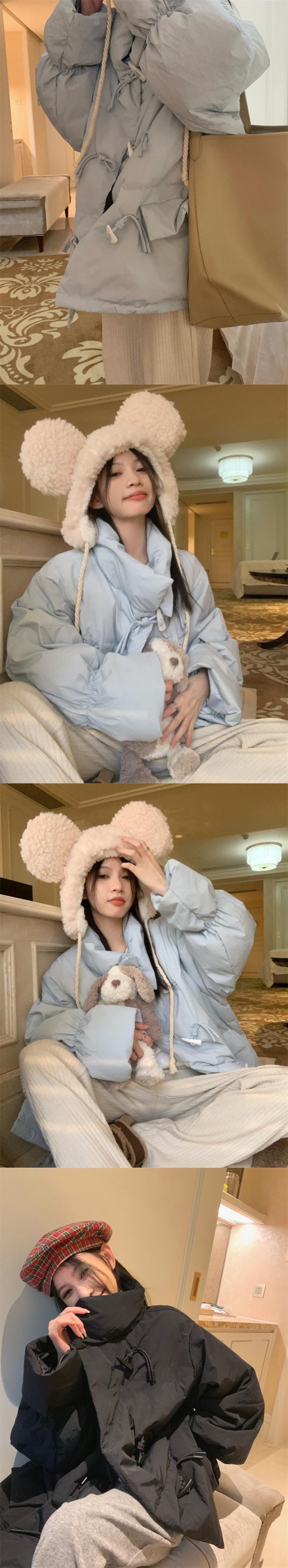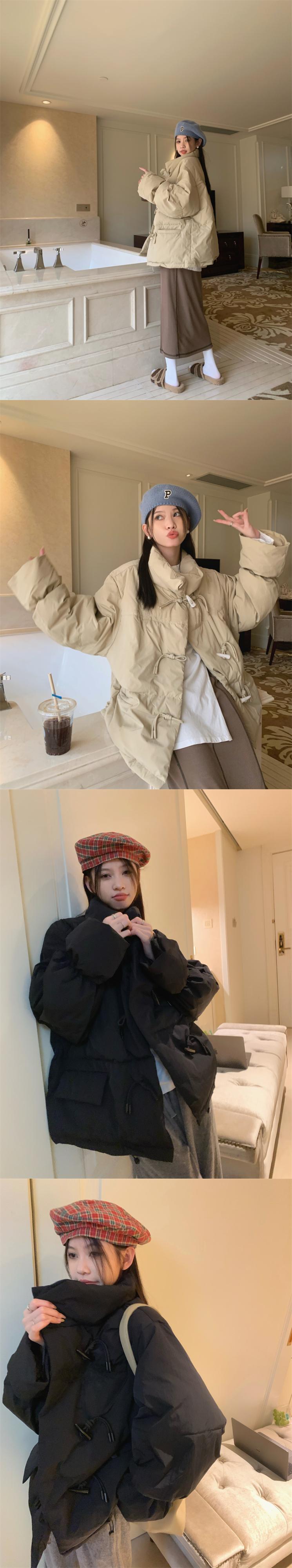 ホットガール黒ターンダウン襟牛ホーンボタン綿ジャケット秋緩い肥厚暖かい綿コート服 ブラック コットン オータム 秋物