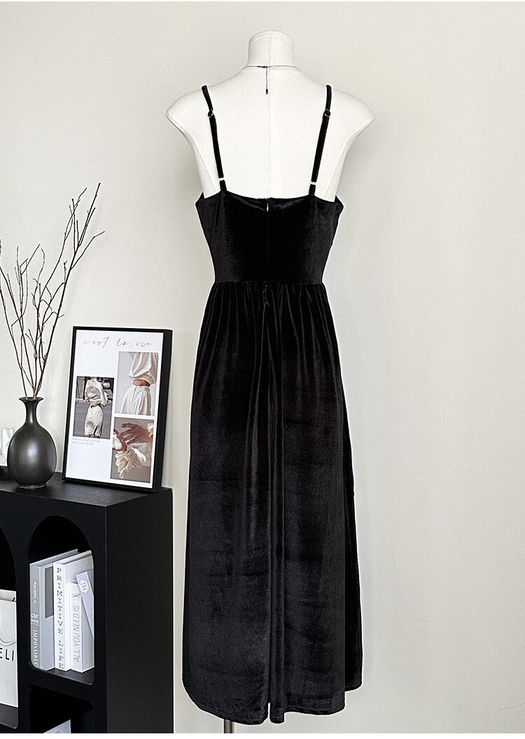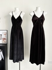 ホットガールスタイル黒ベルベットプリーツ巾着ドレス秋と冬レトロ V ネック背中開いたボトムドレス ブラック オータム 秋物 ウィンター 冬物 Vネック