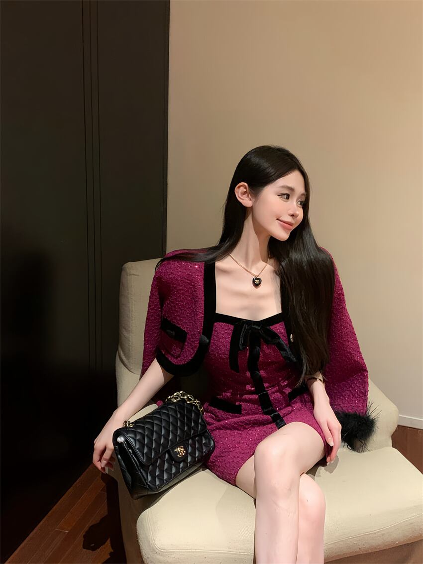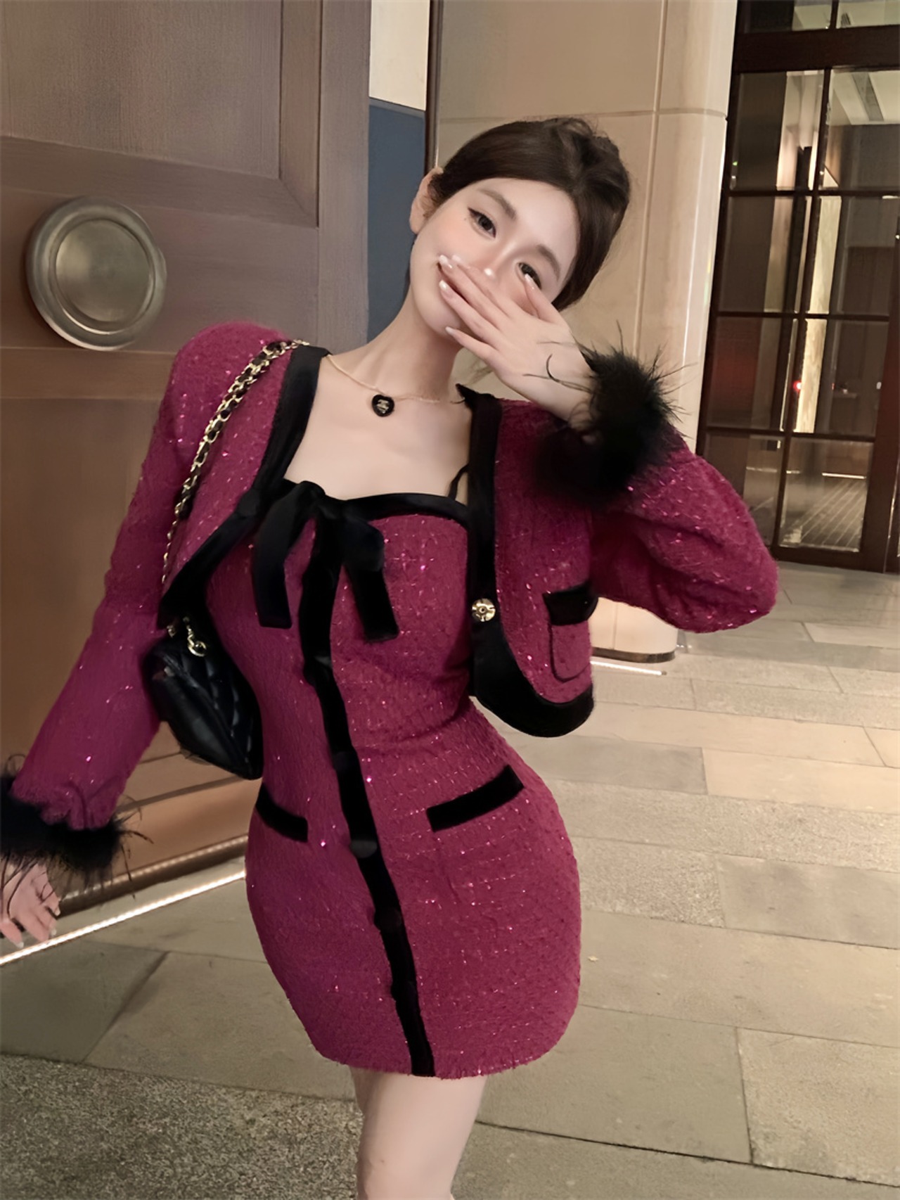 甘いホットガールスーツ秋チェック柄長袖ショートコートスリムフィットストラップドレスツーピースセット服 ロング 大人ガーリー スウィート キュート カジュアル オータム 秋物