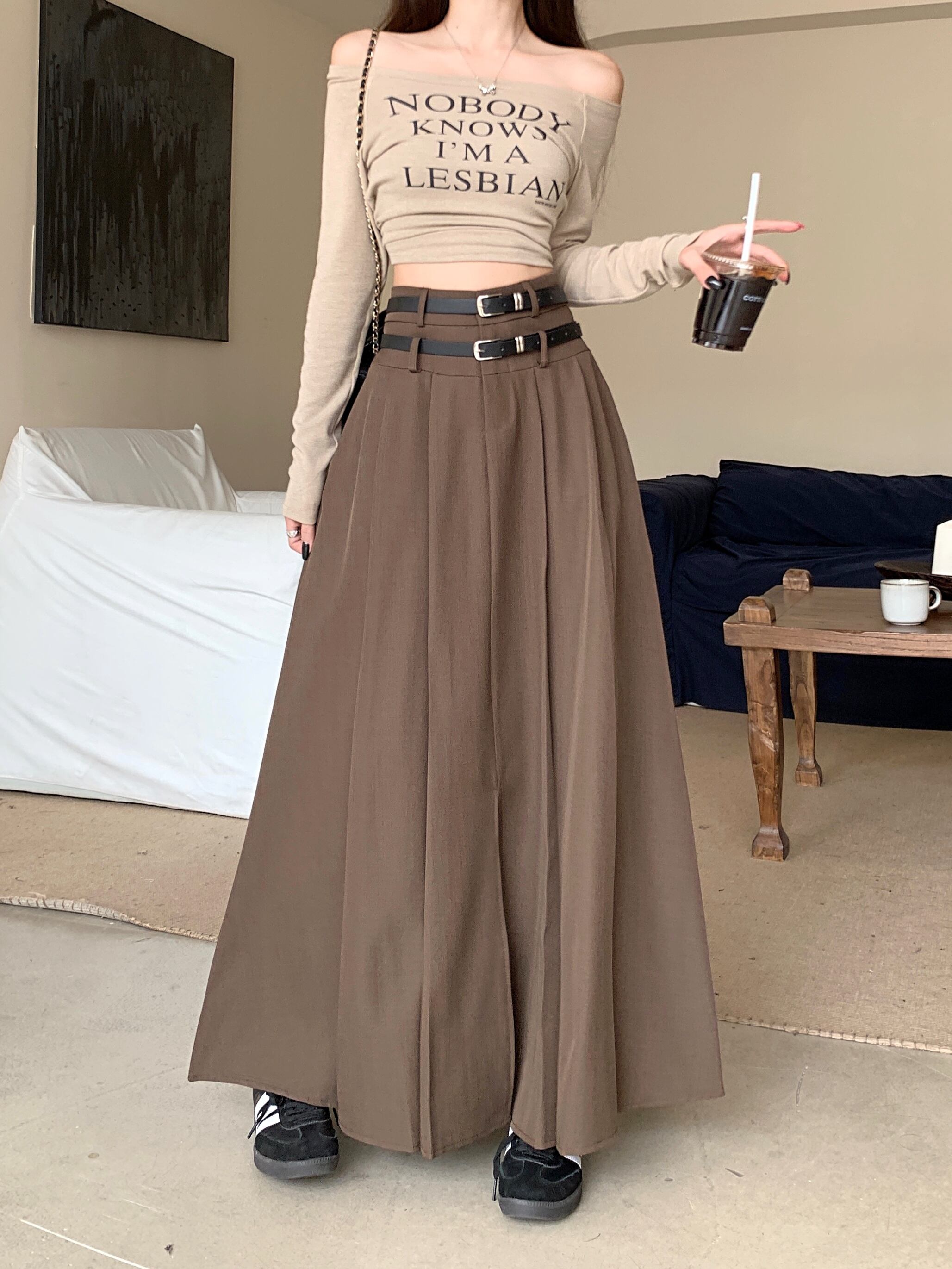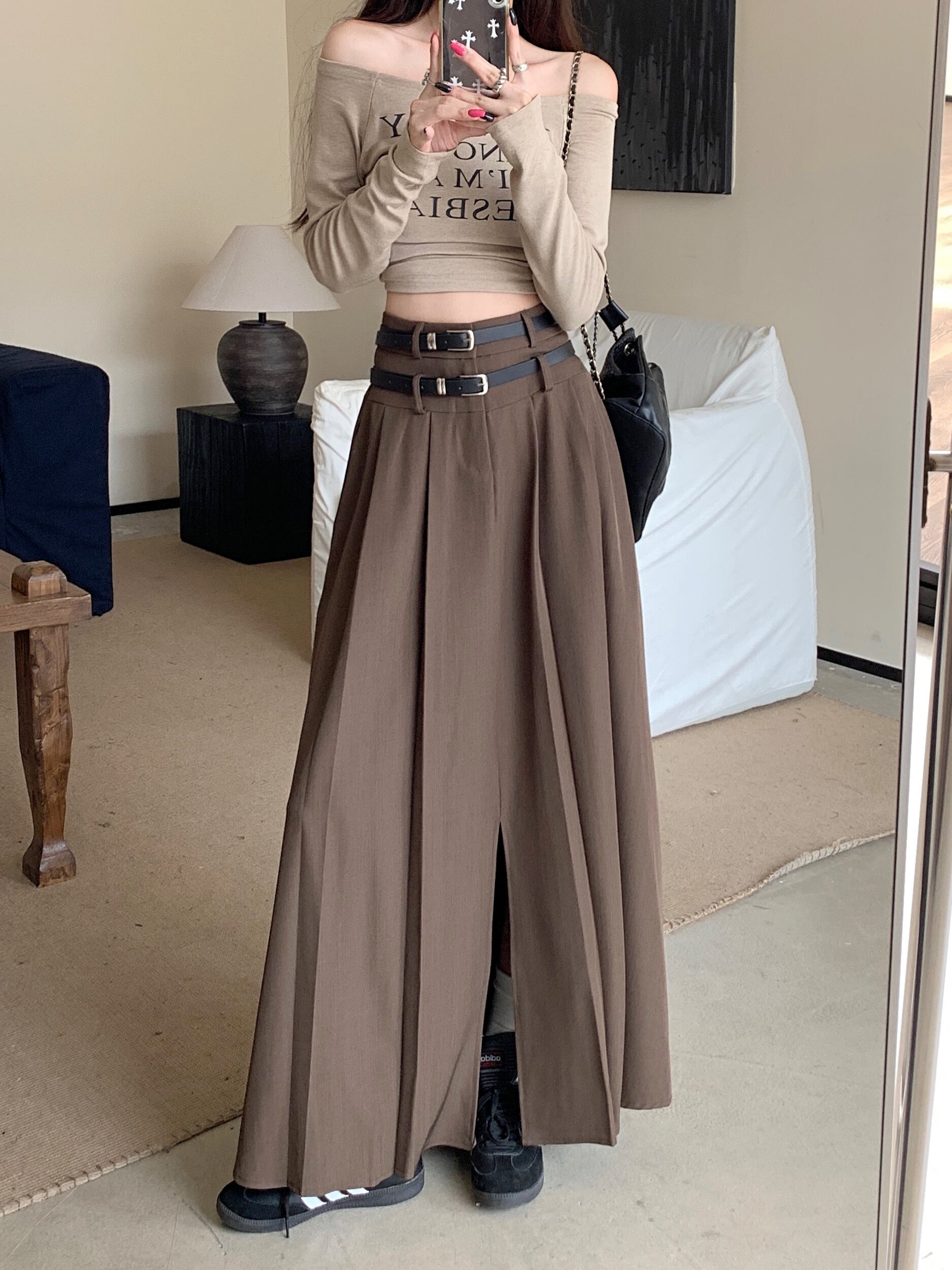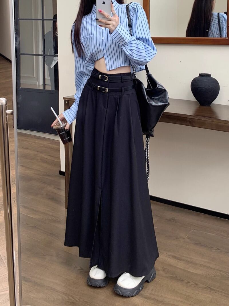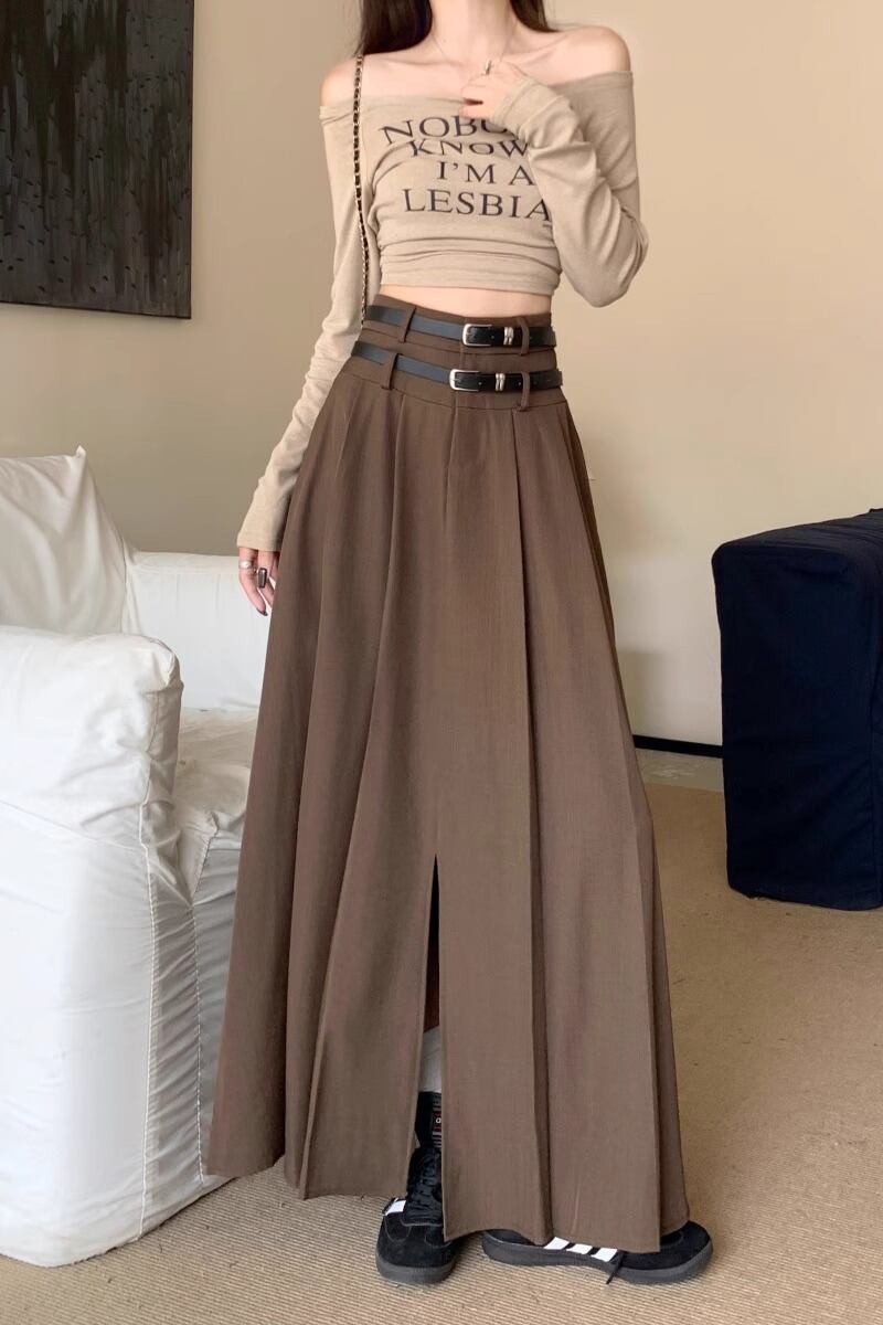 甘いホットガールスリットコーヒースーツスカート秋ダブルベルトウエスト A ライン大スイングロングスカート服 大人ガーリー スウィート キュート カジュアル オータム 秋物 ハーネス Aライン