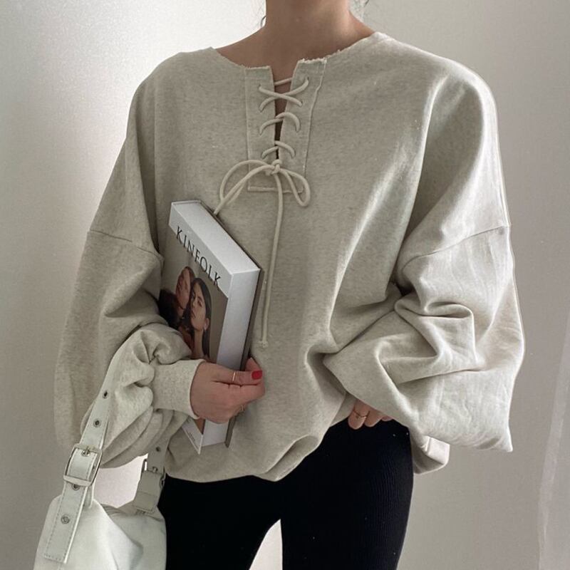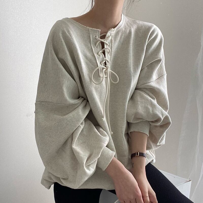 Gothiscyn 秋パーカーラウンドネッククロスレースリボンルーズで多用途ロングパーカートップ服 オータム 秋物 Oネック