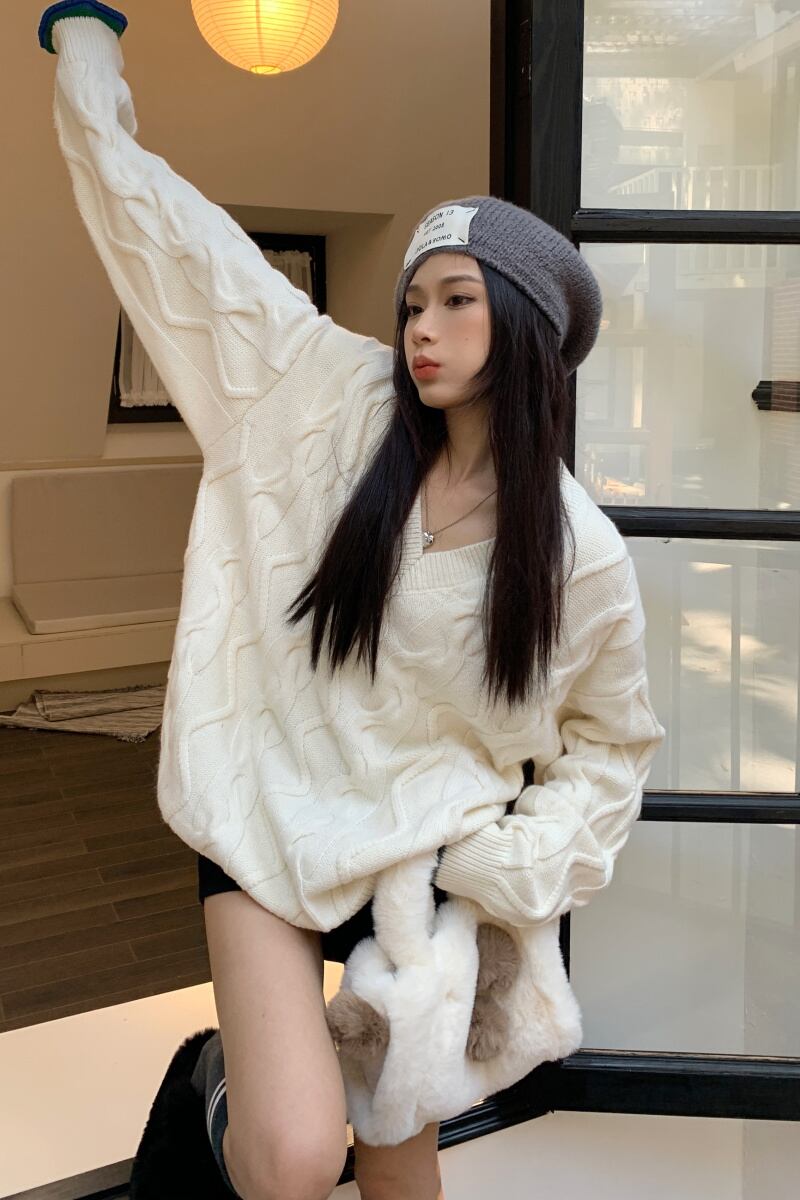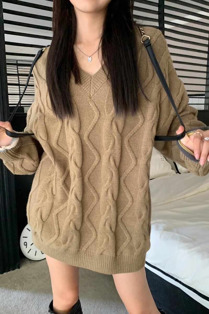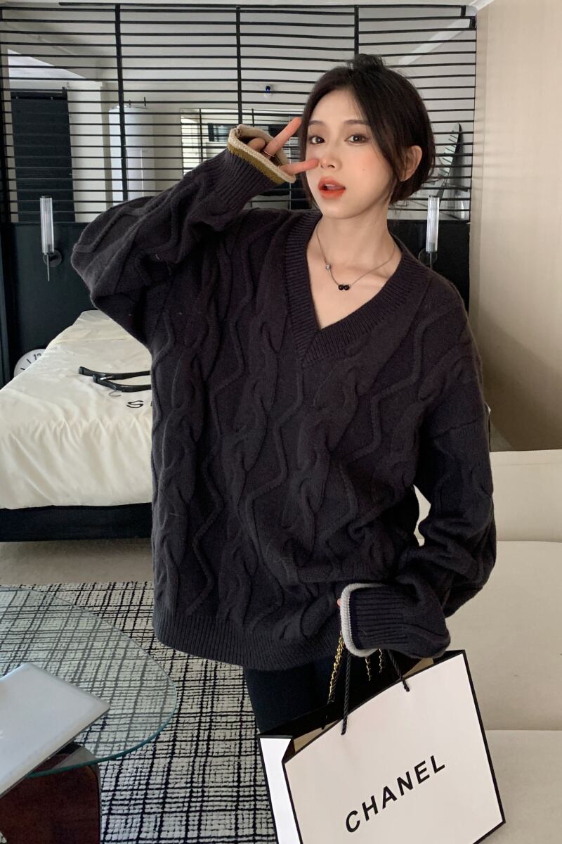 甘いホットガール V ネックニットプルオーバー秋長袖ソフトルーズミッドレングスセーター服 ロング 大人ガーリー スウィート キュート カジュアル オータム 秋物 Vネック