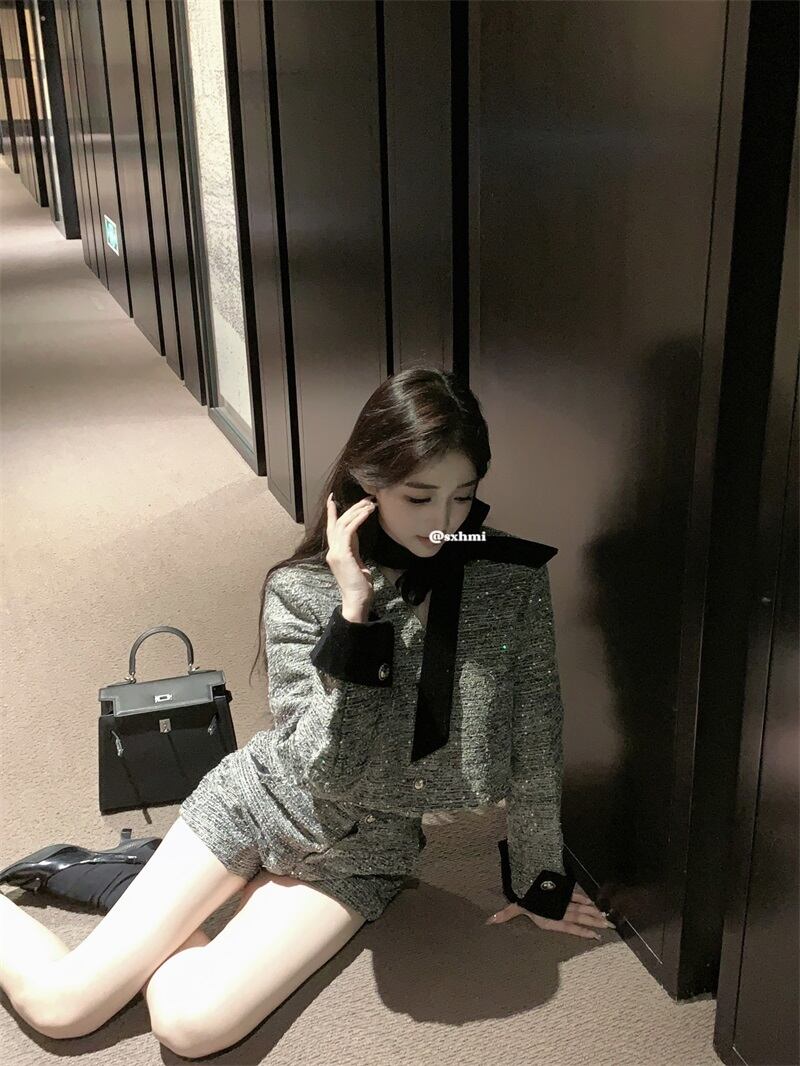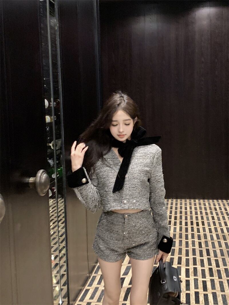 フレンチスイートホットガールスーツ秋ツイードVネックコートウエストショートパンツツーピースセット服 大人ガーリー スウィート キュート カジュアル オータム 秋物 シルク