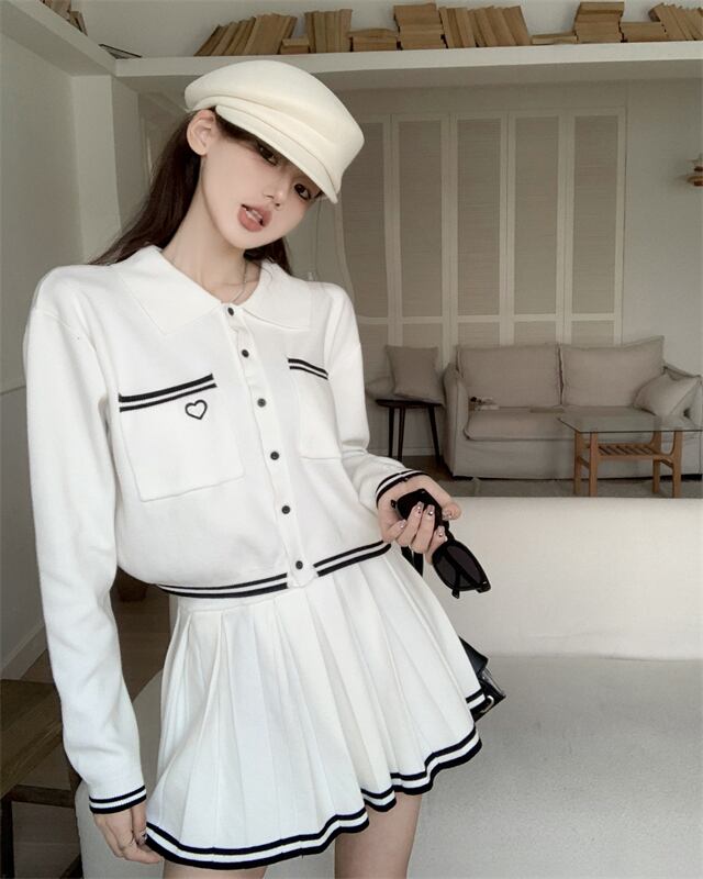 スイートガールスーツ夏長袖ポロネックコントラストニットシャツウエストショートスカートツーピースセット服 ロング 大人ガーリー スウィート キュート カジュアル サマー 夏物 Oネック