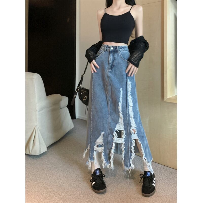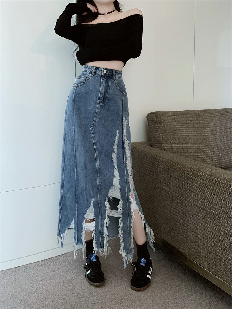 フレンチスタイル甘いホットガールスカート秋ルーズ頑丈ミッドレングスウエストデニムロングスカート服 大人ガーリー スウィート キュート カジュアル オータム 秋物